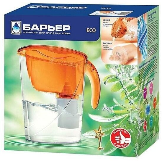Кувшин-фильтр для очистки воды Барьер серии Эко цвета янтарь 2,6 + 1,1 л. Обновлённый дизайн в экологичном стиле пользуется большой популярностью среди покупателей. Кувшин оснащён изящной текстурированной ручкой и воронкой с уникальной конструкцией, не допускающей смешивание нефильтрованной и очищенной воды.