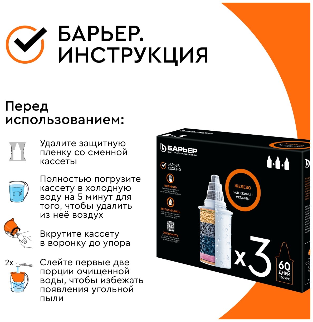 Кассеты «Железо» для фильтров-кувшинов призваны удалить вредные примеси и запах хлора. Ионообменные смола и волокно, входящие в состав изделий, освобождают воду от тяжелых металлов и железа, в том числе растворенного.