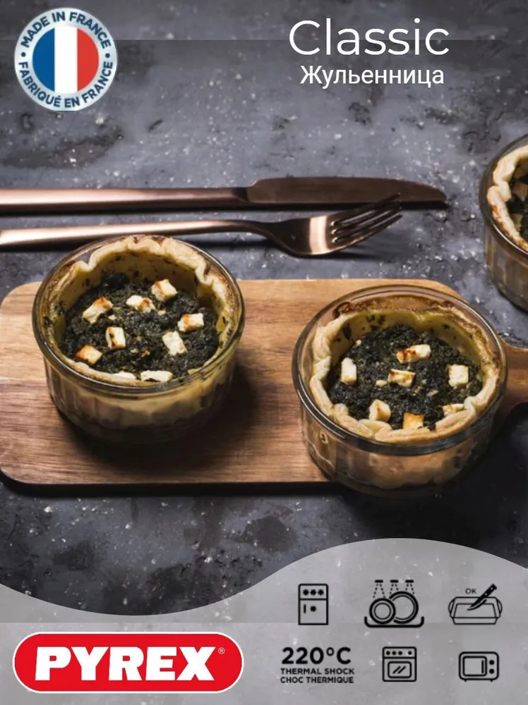Жюльенница PYREX, 10 см из жаропрочного боросиликатного стекла идеально подходит для приготовления порционных мини-блюд из овощей, грибов, морепродуктов. Она полностью прозрачная, что позволяет видеть слоистую структуру блюд. Благодаря особому составу она выдерживает воздействие как минусовых температур, так и высоких плюсовых (от -40 до 300 градусов). Готовый жюльен можно хранить в холодильнике, а затем разогревать в микроволновке. Допускается мытьё машинным способом. Посуда не царапается от столовых приборов, не трескается при ударах и служит десятки лет.