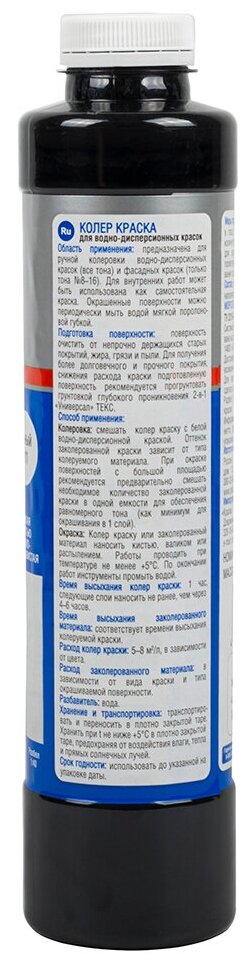 Область применения: предназначена для ручной колеровки водно - дисперсионных красок (все тона) и фасадных красок (только тона № 8 - 16). Для внутренних работ может быть использована как самостоятельная краска. Окрашенные поверхности можно многократно мыть мягкой поролоновой губкой.