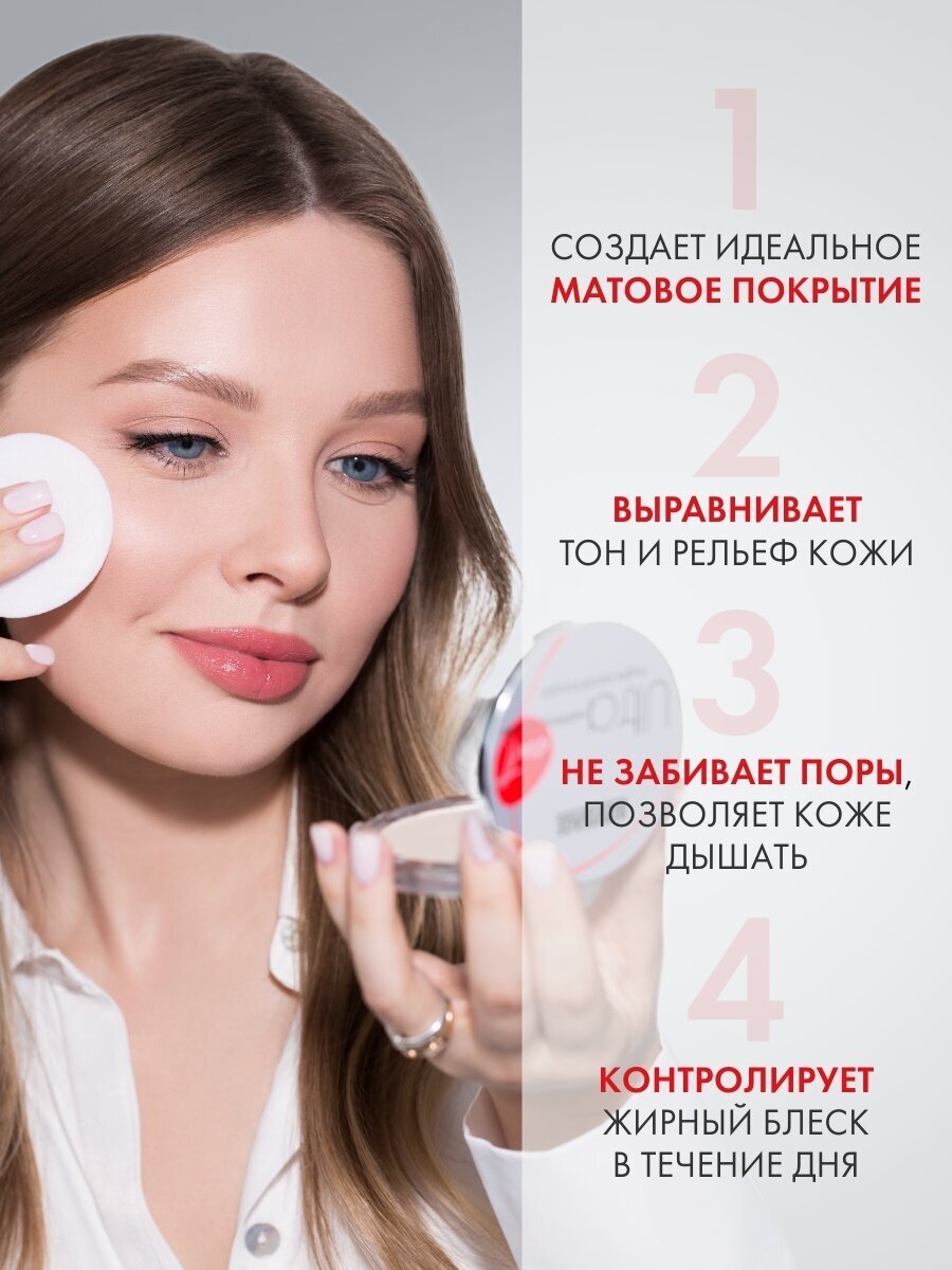 Пудра для лица — выравнивает тон, уменьшает видимость пор и морщин. С матовым финишем — устраняет жирный блеск. Закрепляет кремовые текстуры и фиксирует макияж. Футляр с зеркалом и спонжем — удобно использовать вне дома.