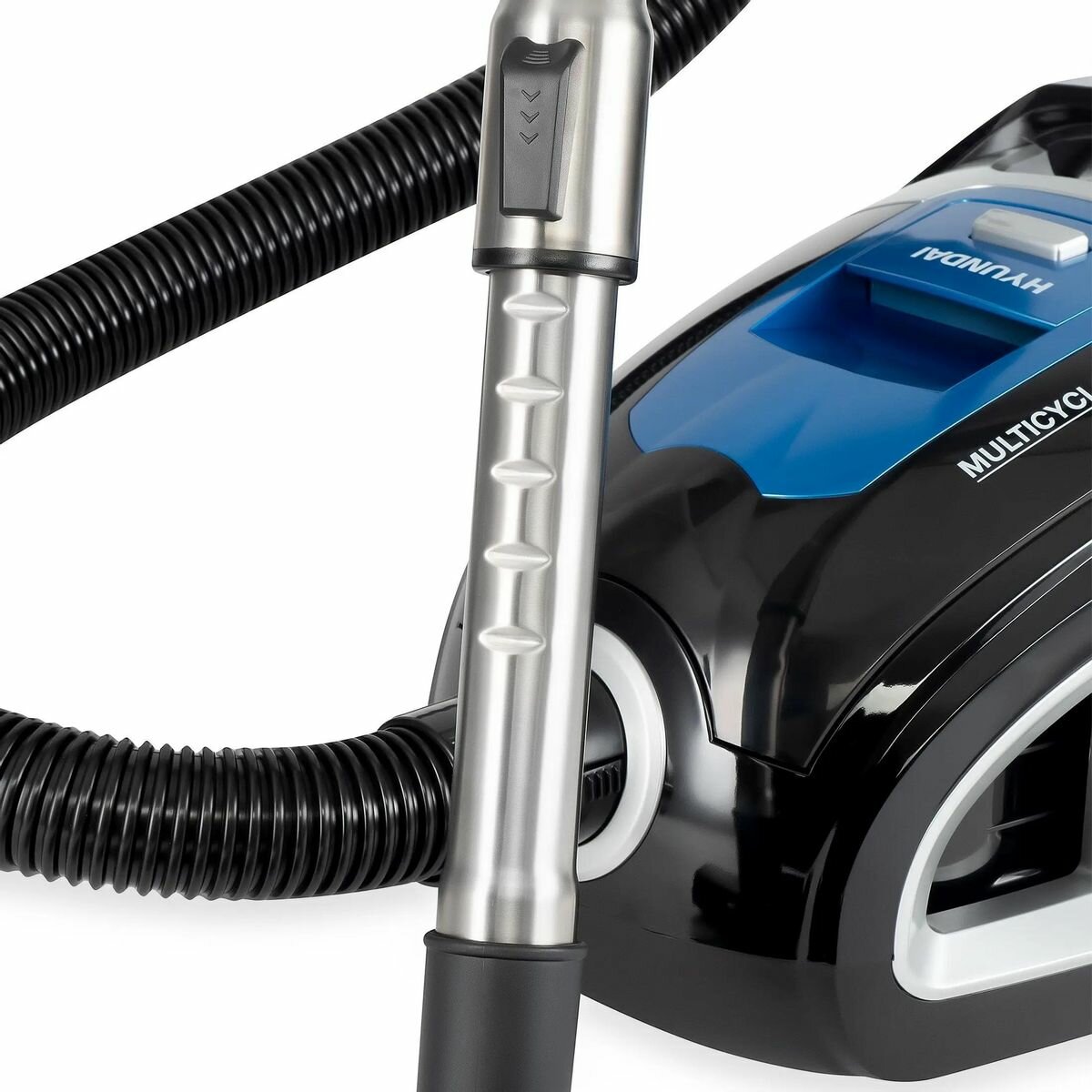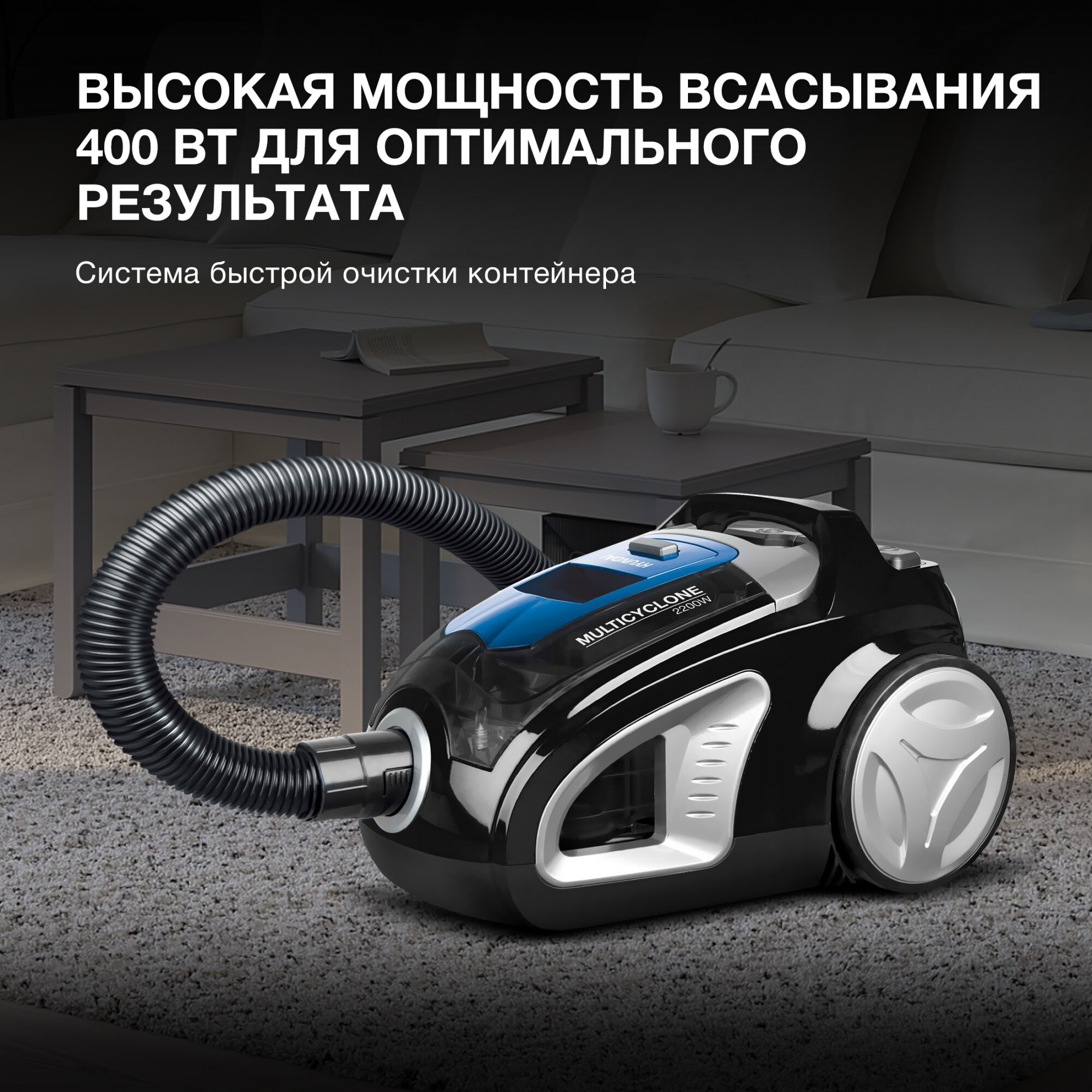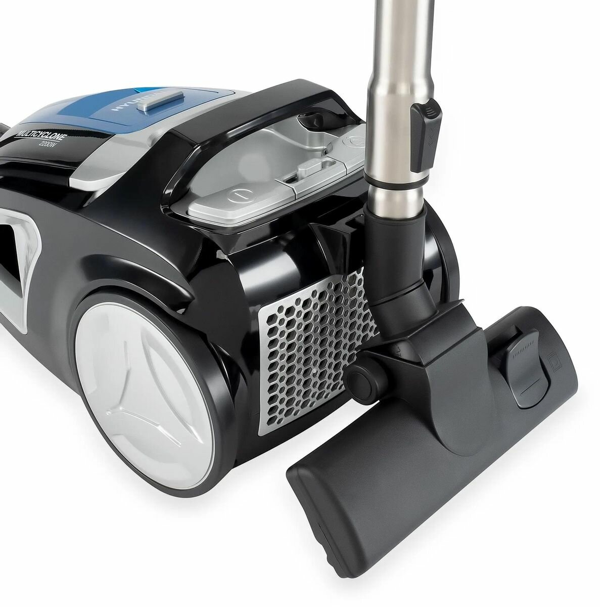 Пылесос Hyundai HYV-C2530 черный/синий, мощность 2200Вт, уборка: сухая, объем пылесборника 3.5л, мощность всасывания 400Вт, регулировка мощности на корпусе, длина шнура 5м