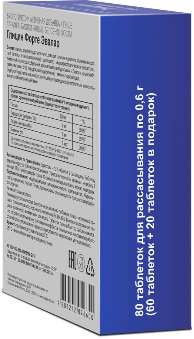 Глицин Форте Эвалар таб.д/рассас.60мг №60+20 таб.в подарок