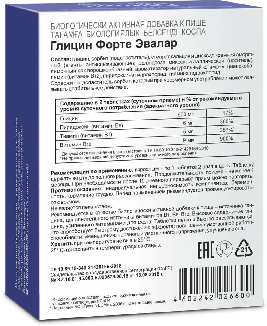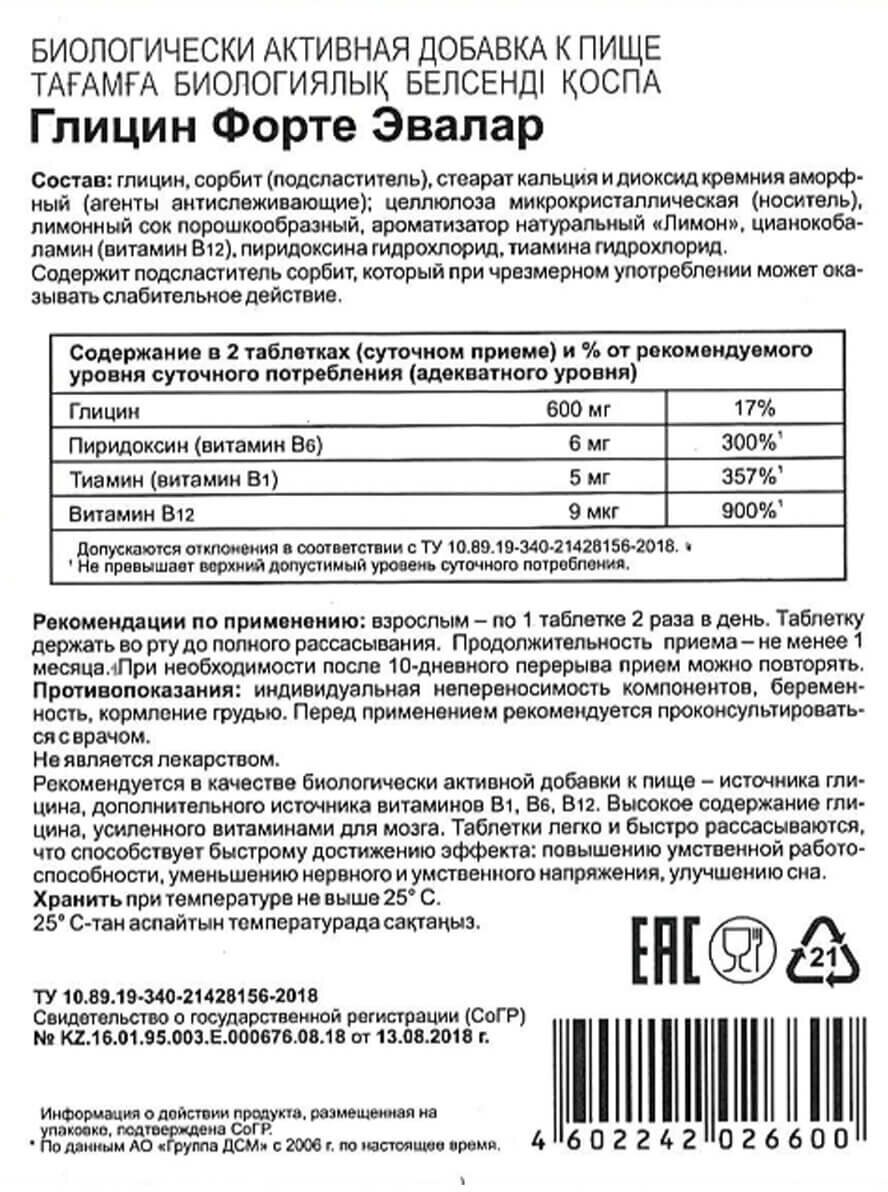| Состав | Глицин, сорбит (подсластитель), стеарат кальция и кремния диоксид аморфный (агенты антислеживающие), целлюлоза микрокристаллическая (носитель), лимонный сок порошкообразный, ароматизатор натуральный "Лимон", цианокобаламин (витамин В12), пиридоксина гидрохлорид, тиамина гидрохлорид |
