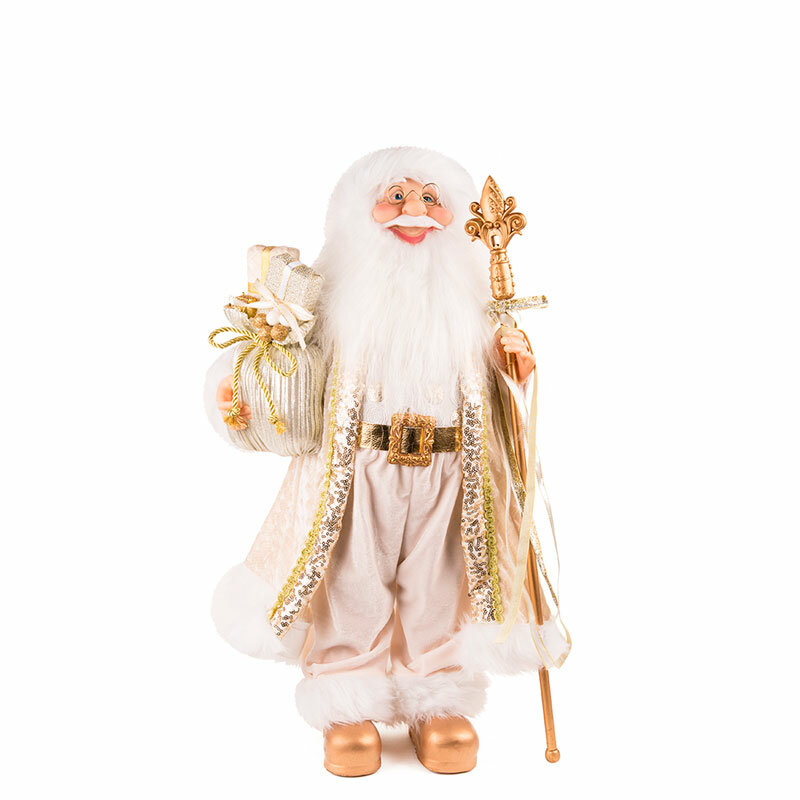 Модель: Дед Мороз в длинной золотой шубке с подарками и посохом 30 см