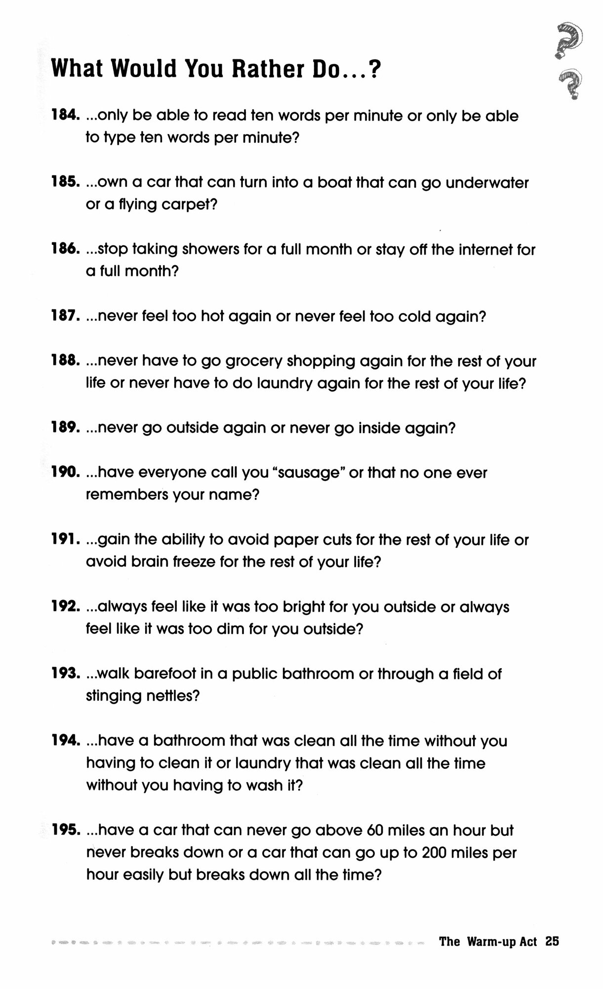 "Would you rather...?" is the ultimate party game and ice breaker. By asking your friends, colleagues, or family members the intriguing, wacky, and thought provoking either-or scenarios presented within you can really get to know what makes them tick. With more than 3,000 questions over 17 categories, you're bound to learn something new about yourself and others.
