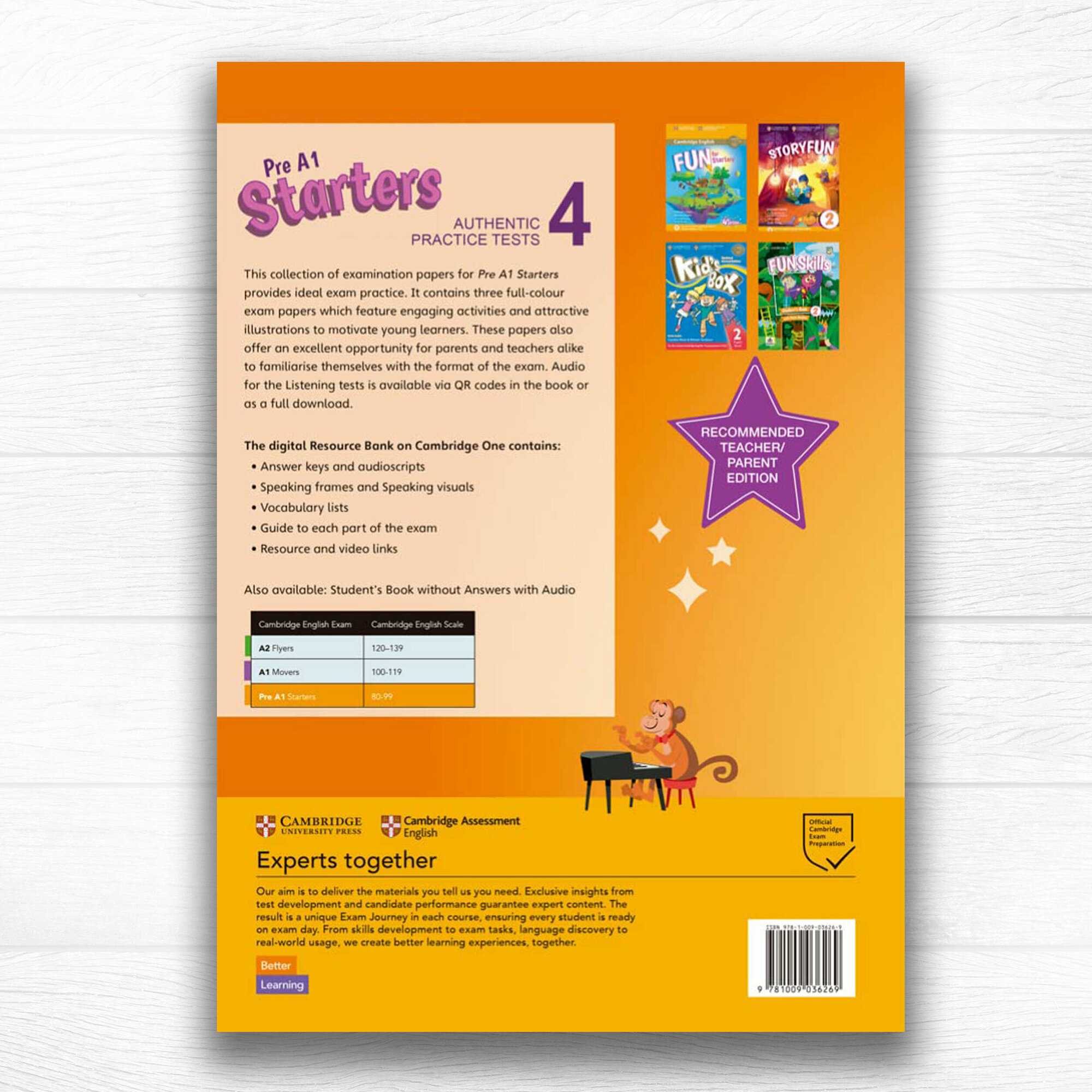 This collection of examination papers for Pre A1 Starters provides ideal exam practice. It contains three full-colour exam papers featuring engaging activities and attractive illustrations to motivate young learners. These papers offer an excellent opportunity for parents and teachers alike to familiarise themselves with the format of the exam and help guide learners. Audio for the Listening is available via QR codes in the book or as a full download. The digital Resource Bank on Cambridge One contains Answer keys, audioscripts, Speaking frames, Speaking visuals, Vocabulary lists, Resource and video links, and a guide to each part of the exam.