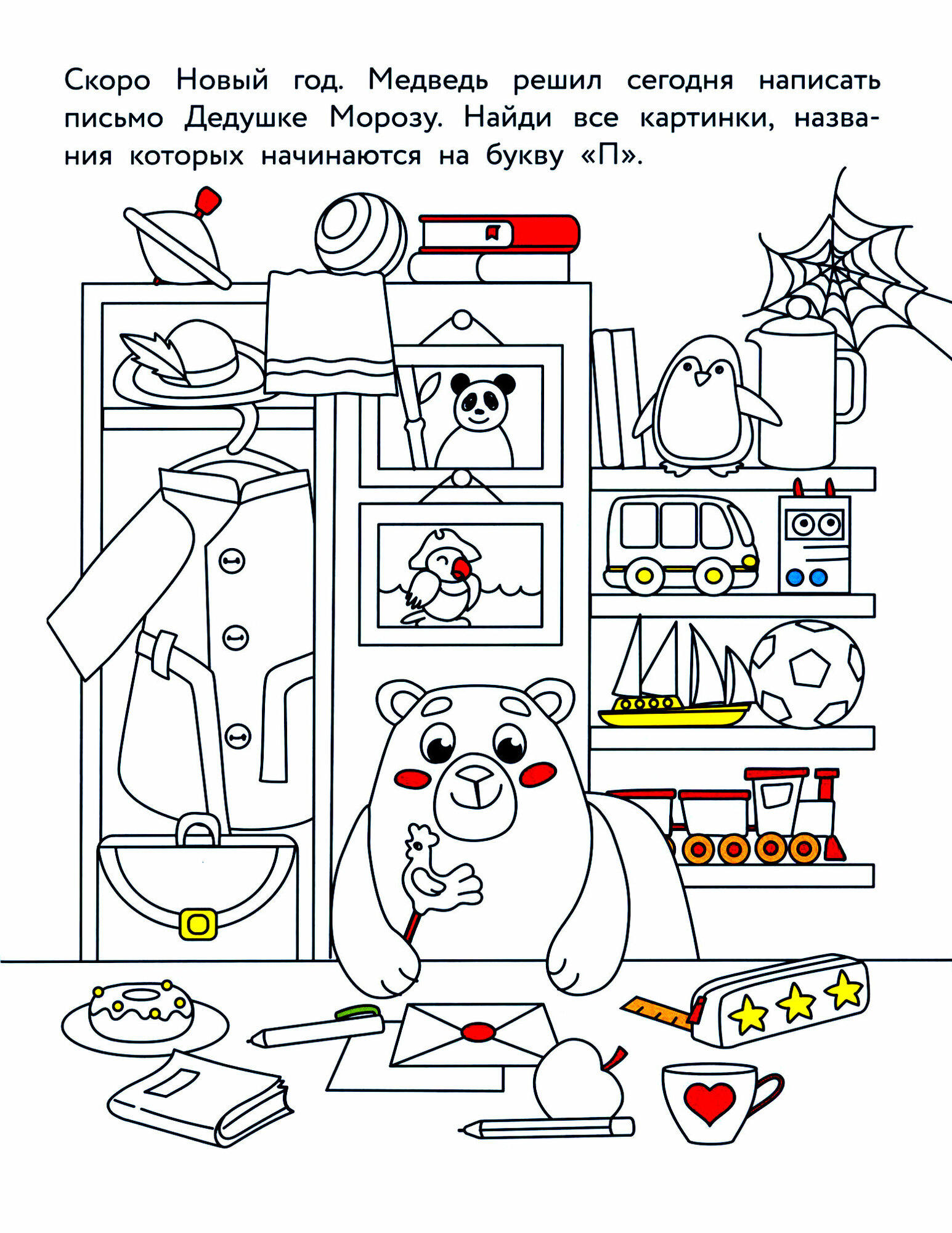 На страницах этой книжки вас ждёт встреча с медведем и его друзьями. Он очень хочет получить подарок на Новый год. Помогите ему отыскать подарок на каждой странице. А ещё мы предлагаем вам вместе с главным героем выполнить разные задания: найдите отличия между картинками, пройдите лабиринты, отыщите неточности. Внизу каждой страницы на голубой полосе загаданы предметы. Найдите их на большой картинке. Ну и, конечно, не забудьте раскрасить всех наших замечательных персонажей!