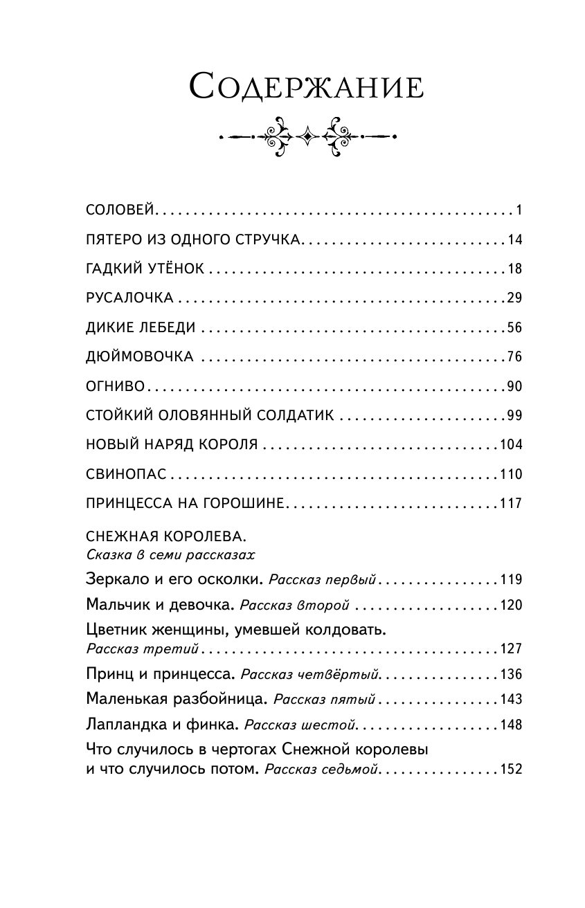 В книгу включены известные произведения Ганса Христиана Андерсена. Среди них история Кая и Герды, чьи сердца оказались неподвластны ледяным осколкам Снежной Королевы благодаря тёплой, искренней дружбе; «Дюймовочка» и «Русалочка», покоряющие читателей трогательными сюжетами об умении справляться с трудностями и всегда быть собой; «Гадкий утёнок» и другие сказки.