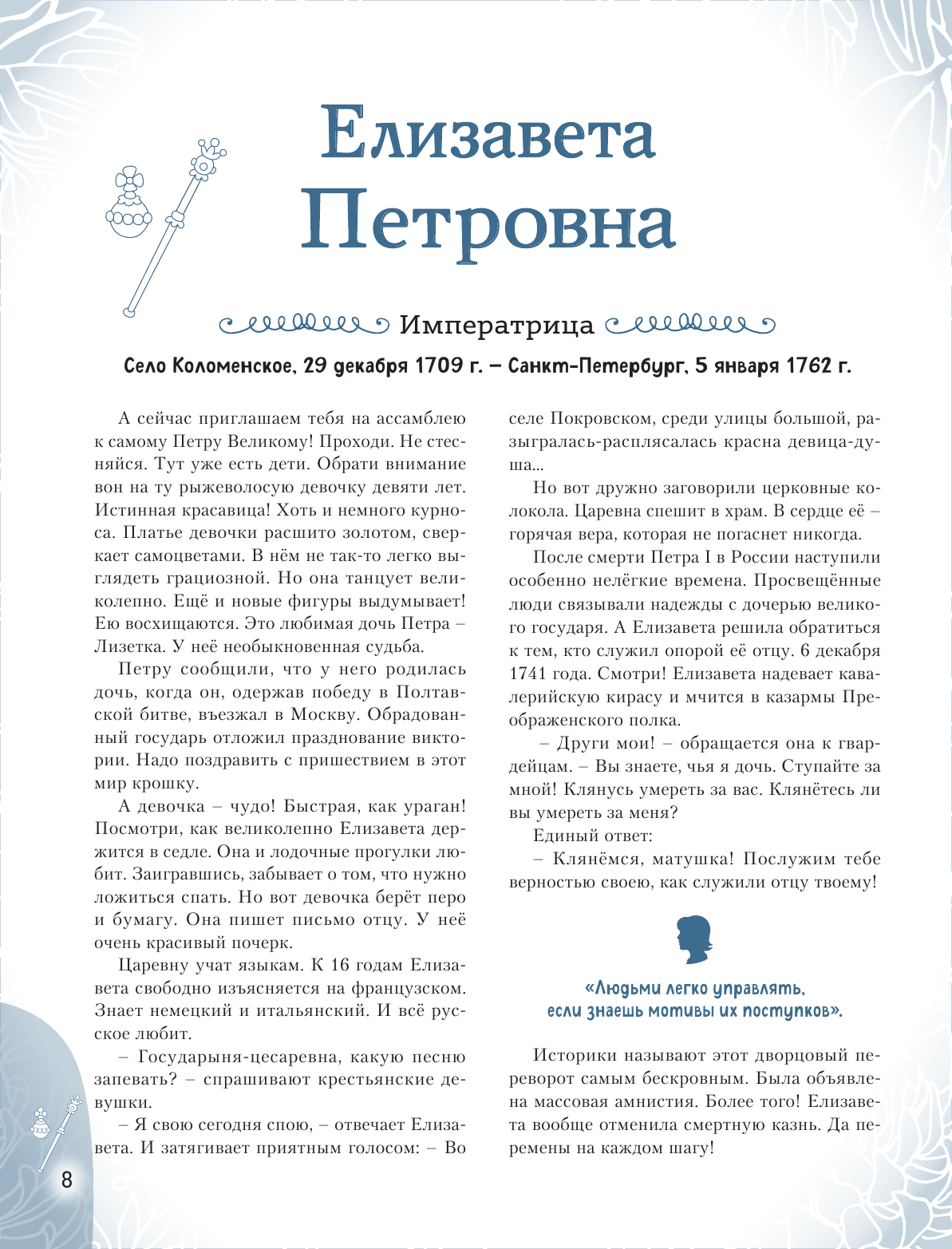 Тогда открывайте эту книгу! В каждом из 20 биографических рассказов, адаптированных для детей 7—10 лет, — невероятный образец силы воли и стойкости характера, мотивирующий девочек на собственные свершения. Их сопровождают красочные полосные иллюстрации и занимательные факты, чтобы знакомиться с выдающимися соотечественниками было наглядно и увлекательно. А ещё это неповторимый подарок для всех, кто гордится историей и культурой своего Отечества!