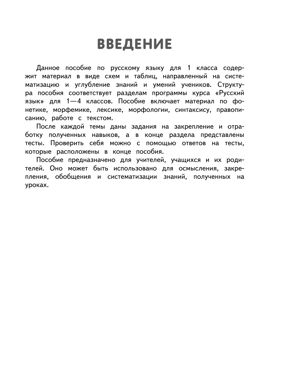 Справочники для учеников начальной школы должны быть краткими и понятными. В данном пособии предельно доступно, в виде таблиц и схем, изложен весь курс русского языка за 1 класс. Такая подача материала делает процесс поиска и запоминания информации максимально быстрым и лёгким. Современное и удобное в использовании пособие полностью соответствует всем требованиям ФГОС начального общего образования.