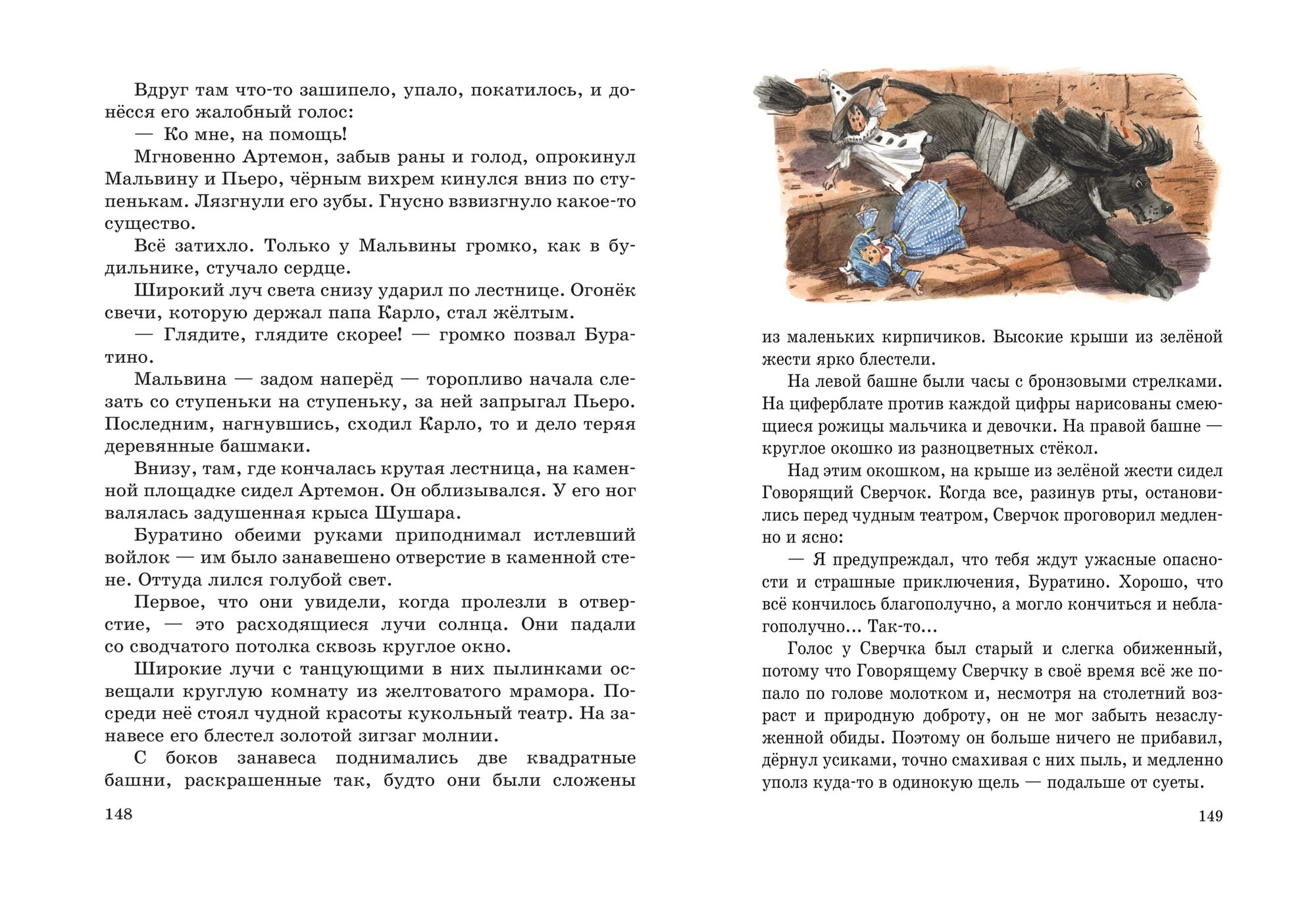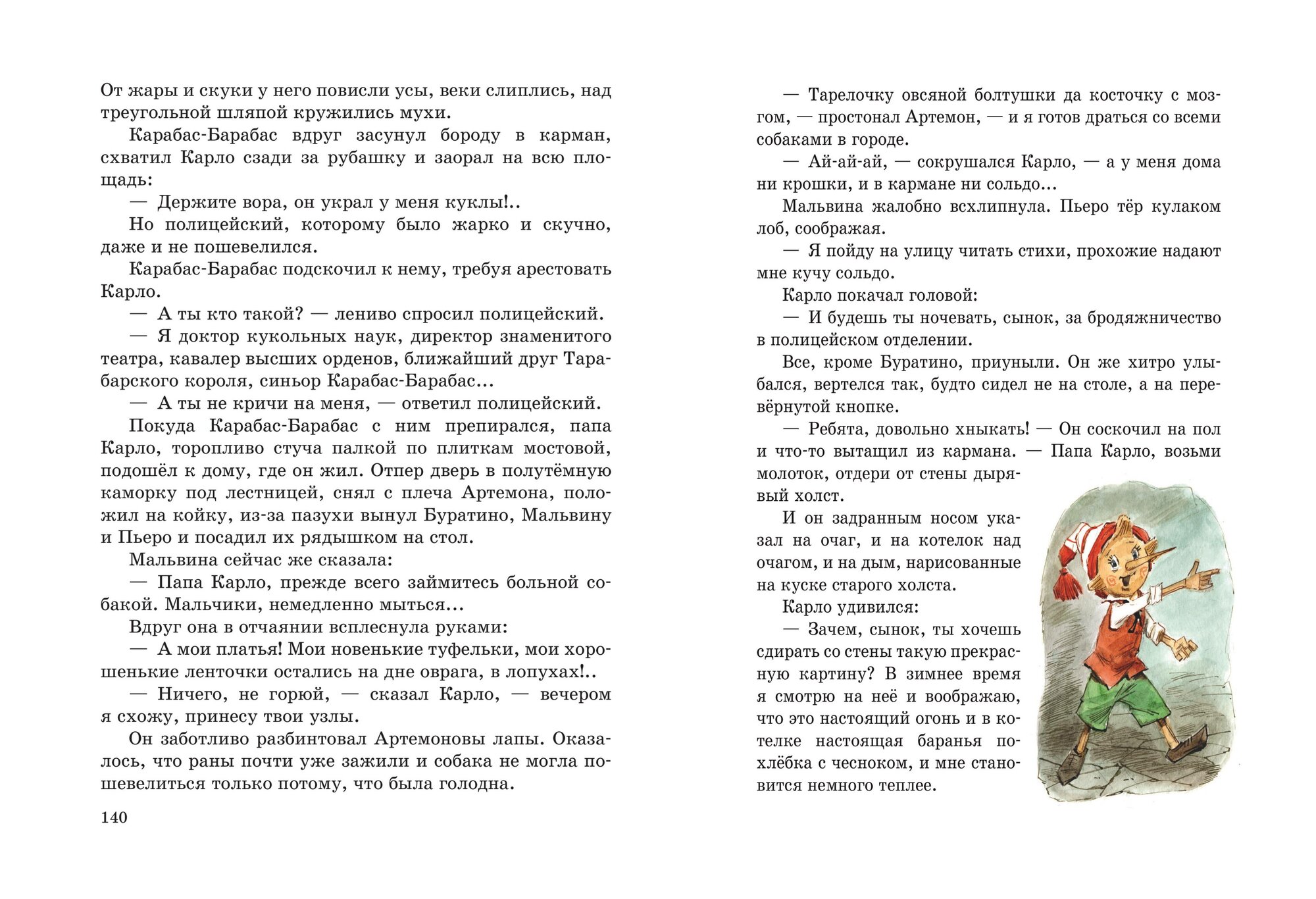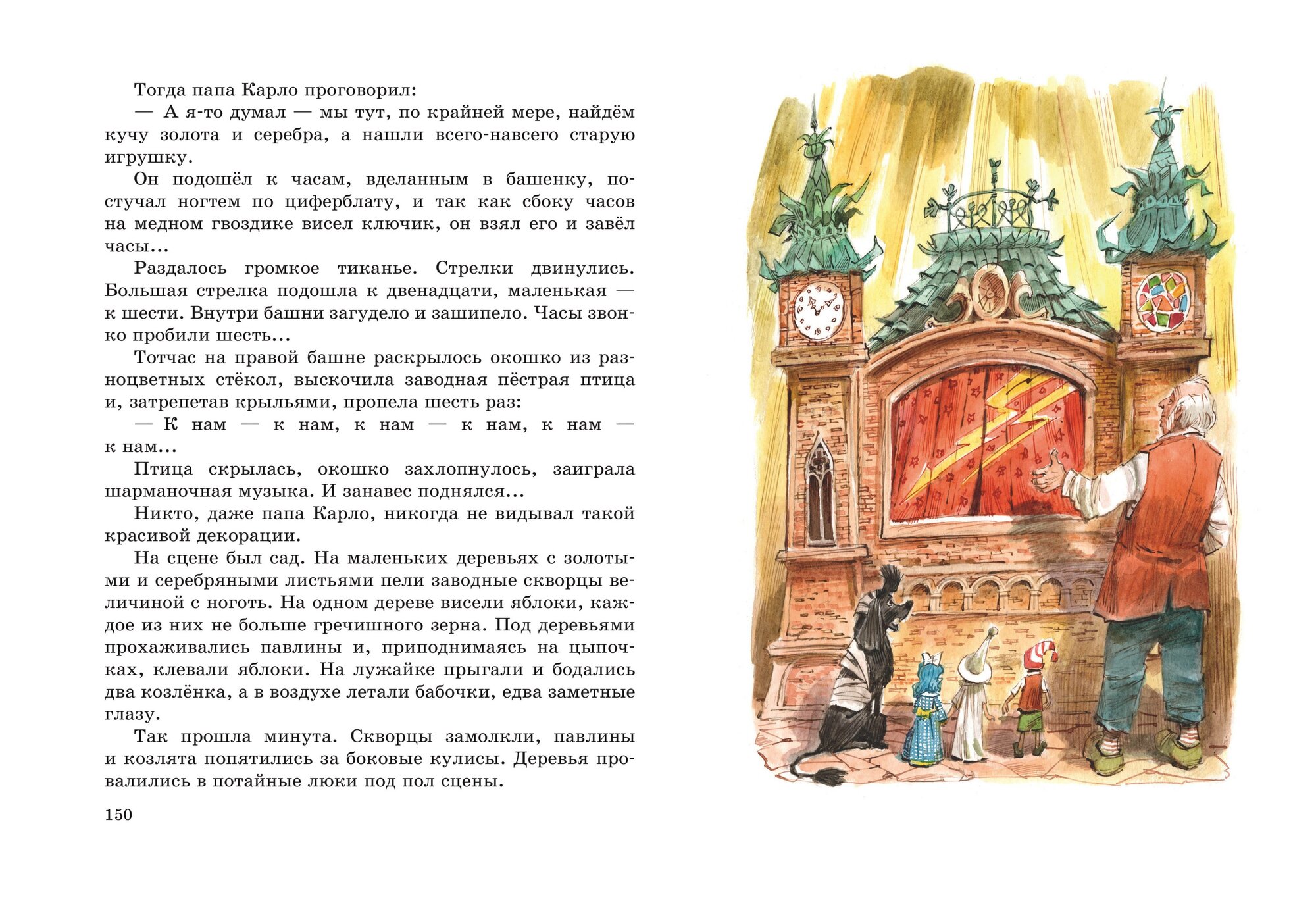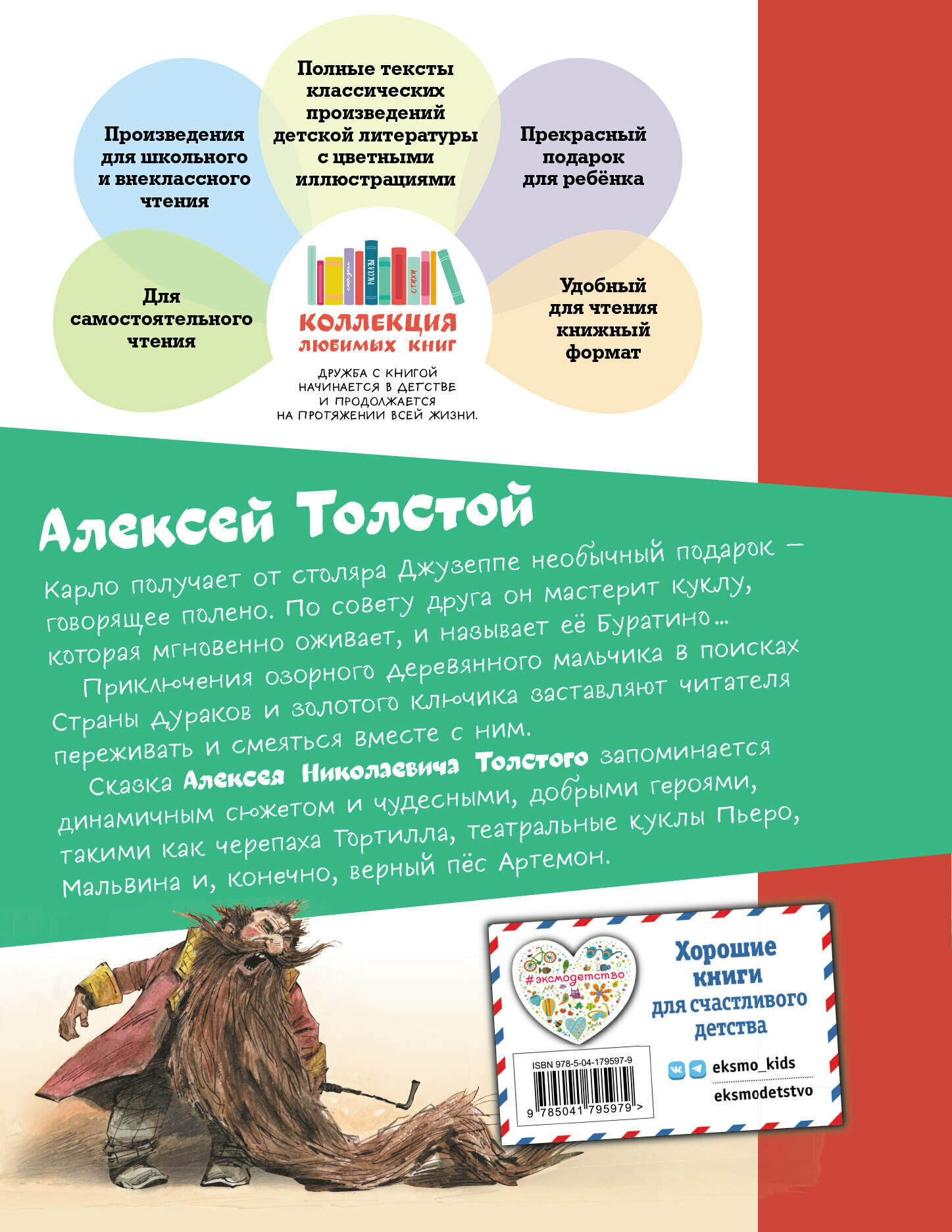 Сказочная повесть о приключениях удивительного деревянного мальчика по имени Буратино и его друзей — театральных кукол Пьеро, Мальвины и верного пса Артемона. История с тайной золотого ключика показывает, что даже грозный и страшный Карабас-Барабас терпит неудачи перед теми, кто имеет доброе сердце и всегда приходит на помощь другому. Книгу дополняют классические цветные иллюстрации известного российского художника Вадима Челака.