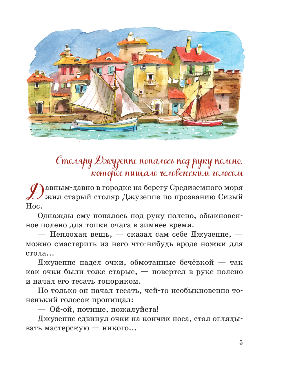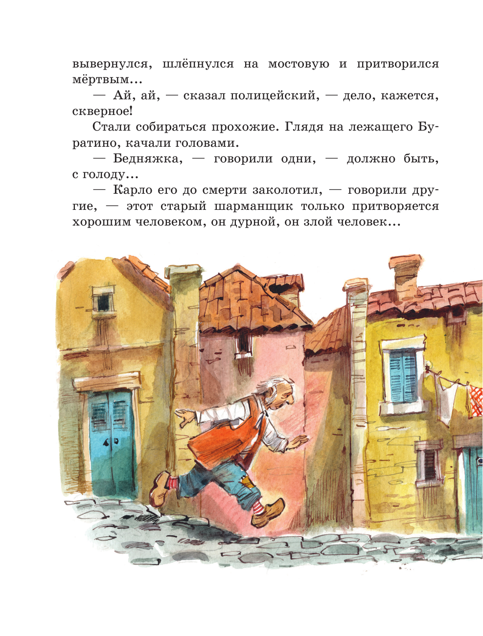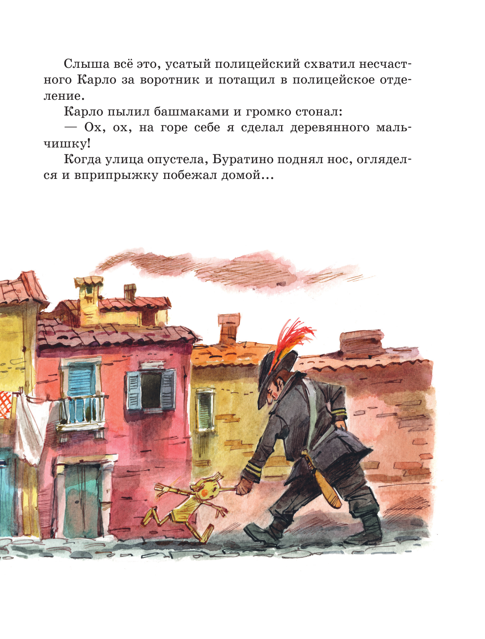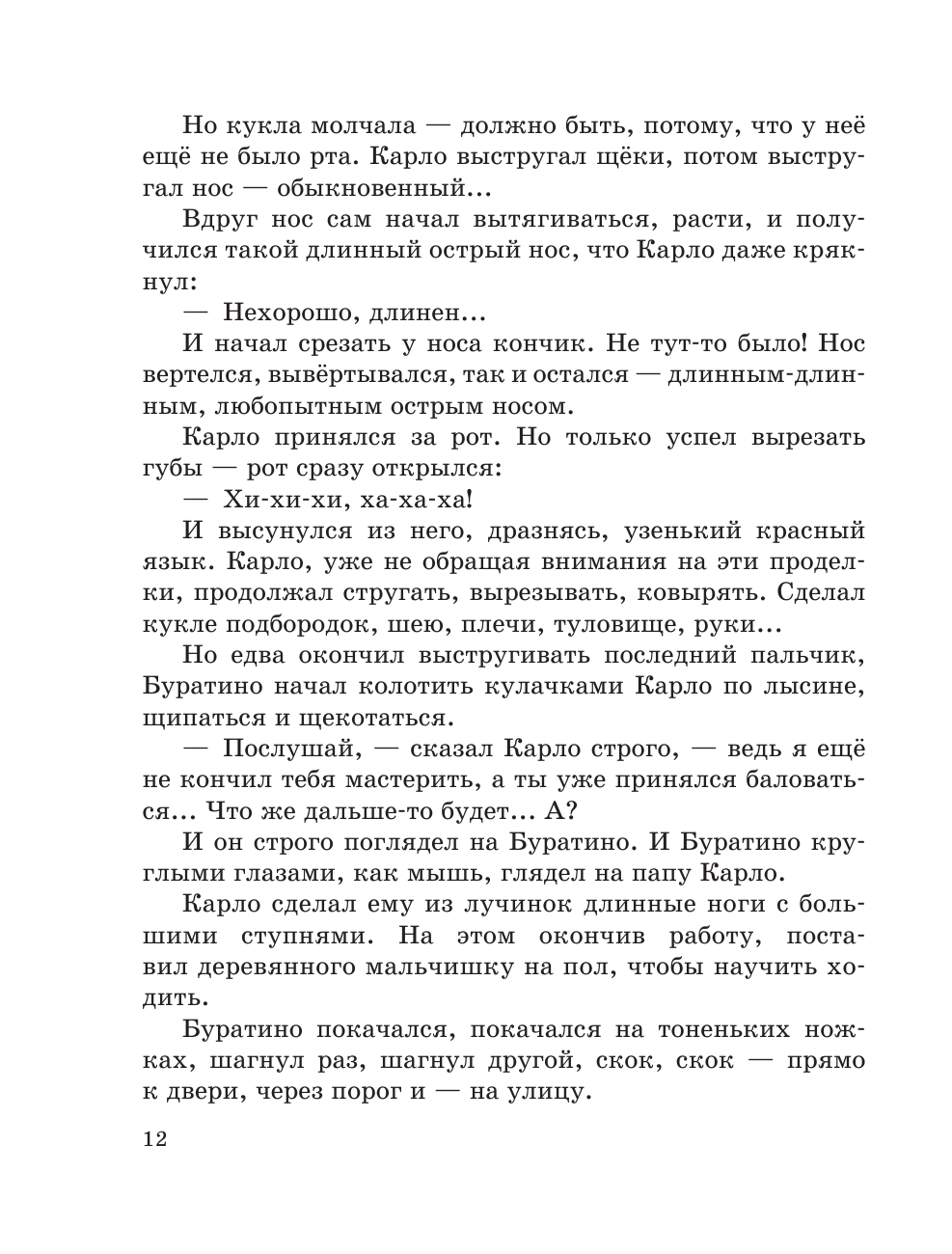 Сказочная повесть о приключениях удивительного деревянного мальчика по имени Буратино и его друзей — театральных кукол Пьеро, Мальвины и верного пса Артемона. История с тайной золотого ключика показывает, что даже грозный и страшный Карабас-Барабас терпит неудачи перед теми, кто имеет доброе сердце и всегда приходит на помощь другому. Книгу дополняют классические цветные иллюстрации известного российского художника Вадима Челака.