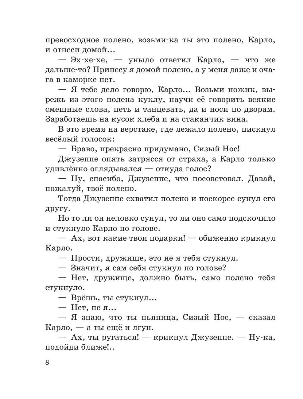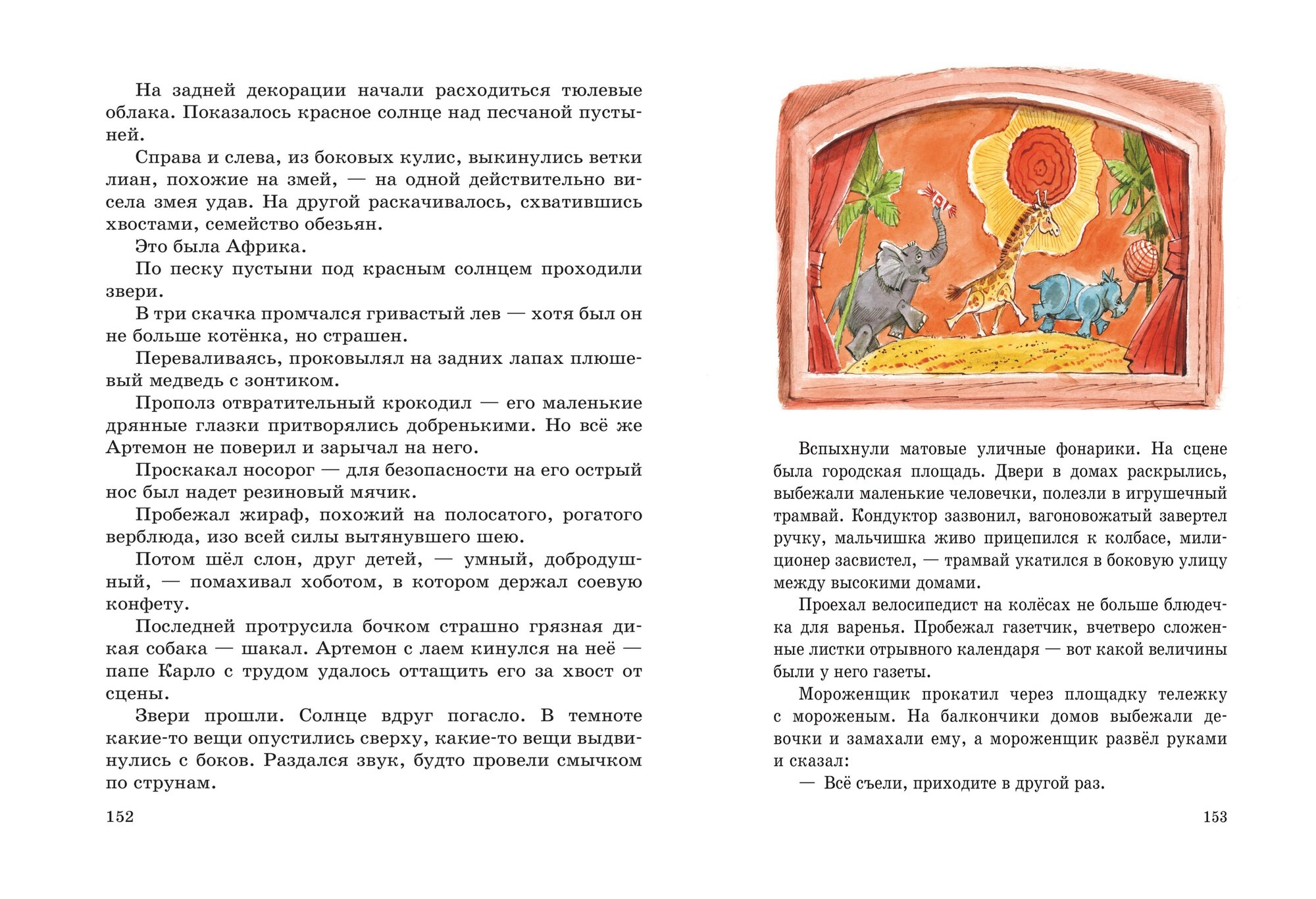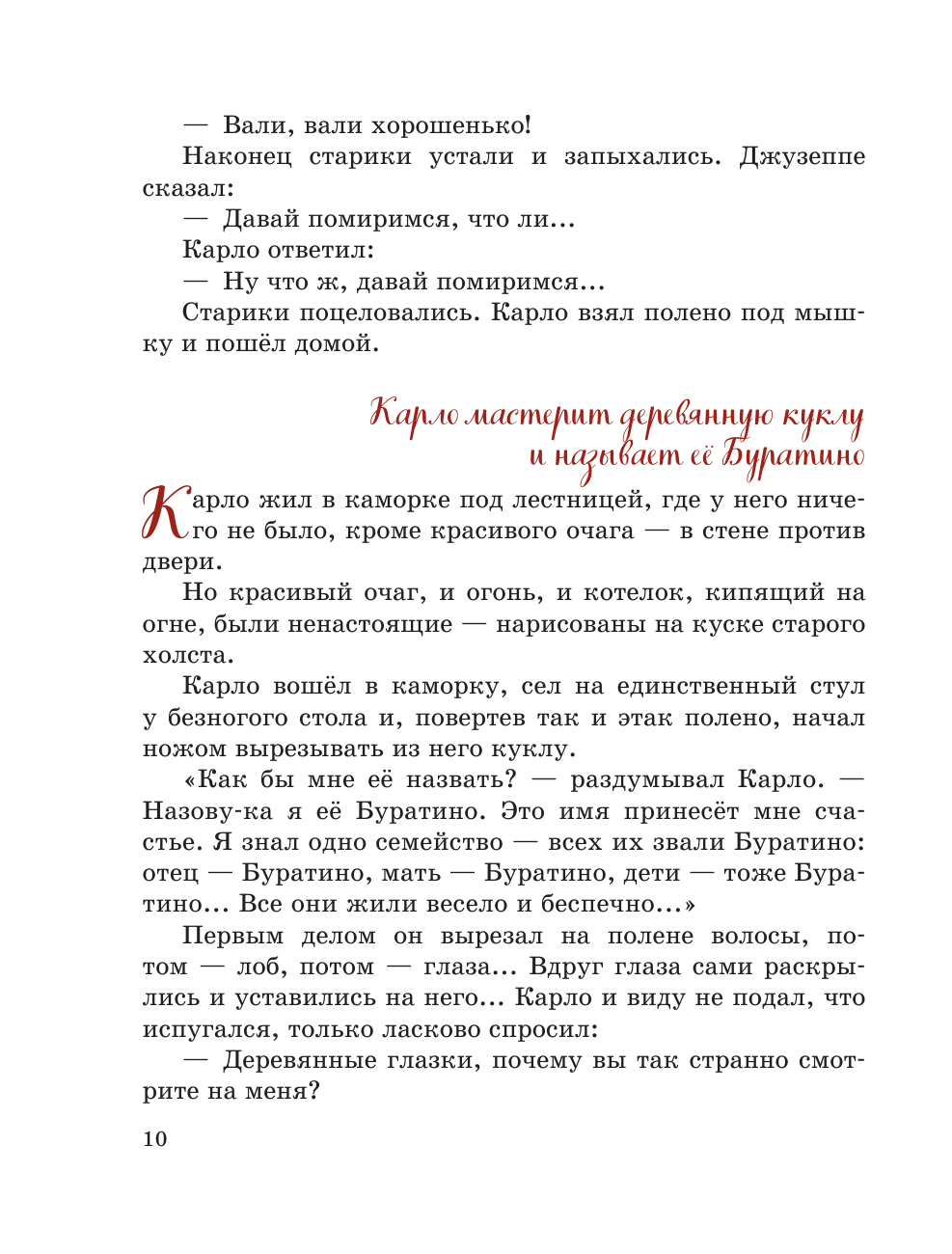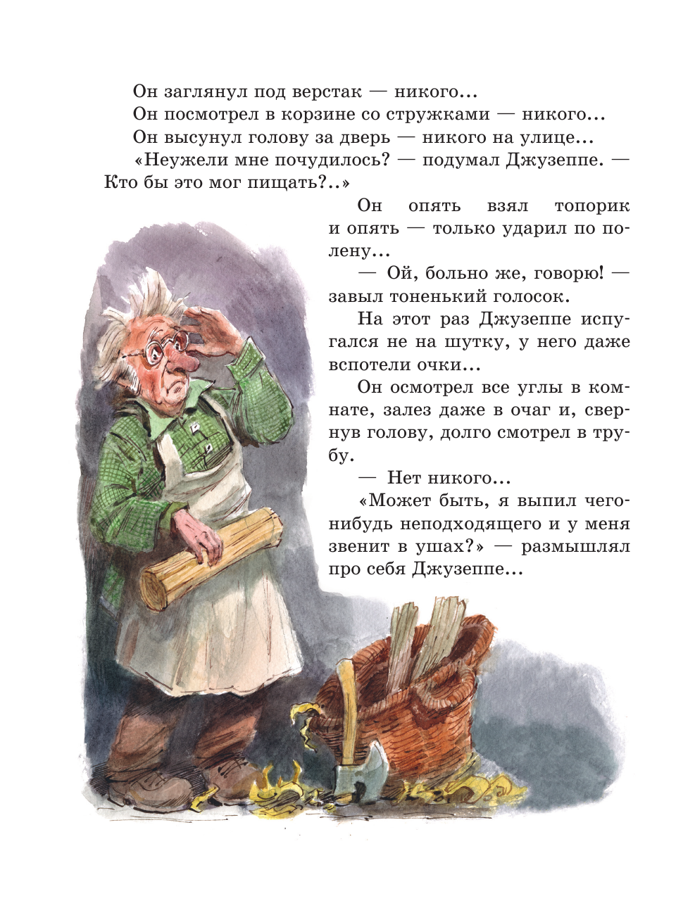 Сказочная повесть о приключениях удивительного деревянного мальчика по имени Буратино и его друзей — театральных кукол Пьеро, Мальвины и верного пса Артемона. История с тайной золотого ключика показывает, что даже грозный и страшный Карабас-Барабас терпит неудачи перед теми, кто имеет доброе сердце и всегда приходит на помощь другому. Книгу дополняют классические цветные иллюстрации известного российского художника Вадима Челака.
