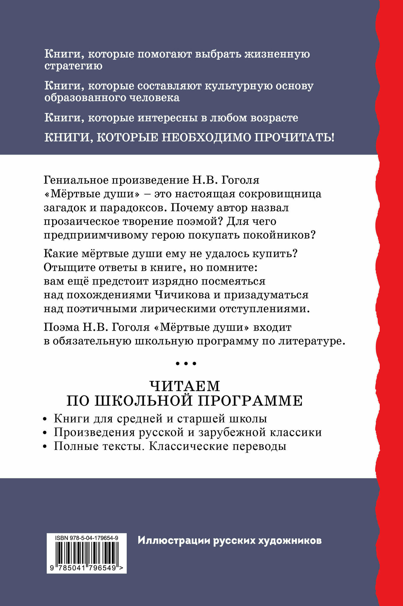 Великое творение Н. В. Гоголя открывает перед нами огромный мир, в котором, как в жизни, есть место трагическому и смешному. В тексте поэмы, словно в энциклопедии, отразилась жизнь целой страны, и к концу первого тома мы уже ясно понимаем, за кем из героев будущее, а кто стал «уходящей натурой». Свои догадки и предположения можно проверить по сохранившимся фрагментам второго тома. Иллюстрации к книге созданы для юбилейного издания поэмы знаменитыми художниками-графиками.
