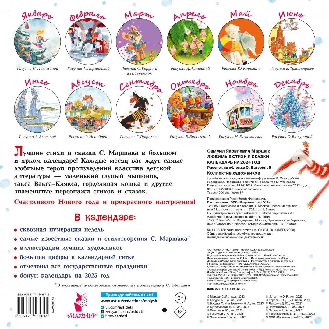 Лучшие стихи и сказки С. Маршака в большом и ярком календаре! Каждые месяц вас ждут самые любимые герои произведений классика детской литературы – маленький глупый мышонок, такса Вакса-Клякса, горделивая кошка и другие знаменитые персонажи стихов и сказок. Счастливого Нового года и прекрасного настроения!