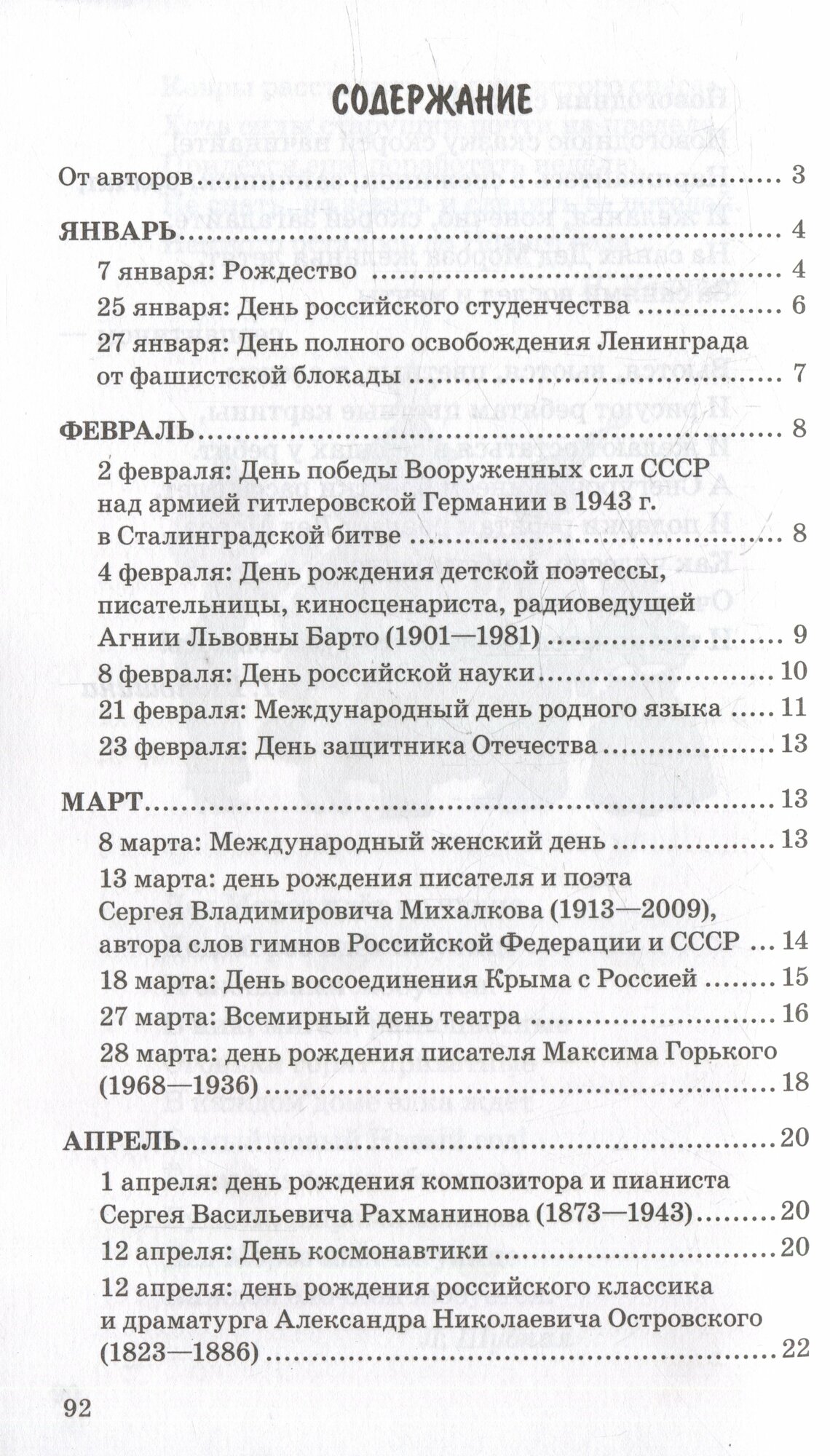 В пособии представлены стихотворения к 66 датам, согласно Федеральному календарному плану воспитательной работы с учётом познавательного, образовательного и воспитательного аспектов, возраста дошкольников (средние и старшие группы ДОО), психологии и мировоззрения детей 5—8 лет, направленные на воспитание патриотизма, расширение кругозора и развитие познавательного интереса.