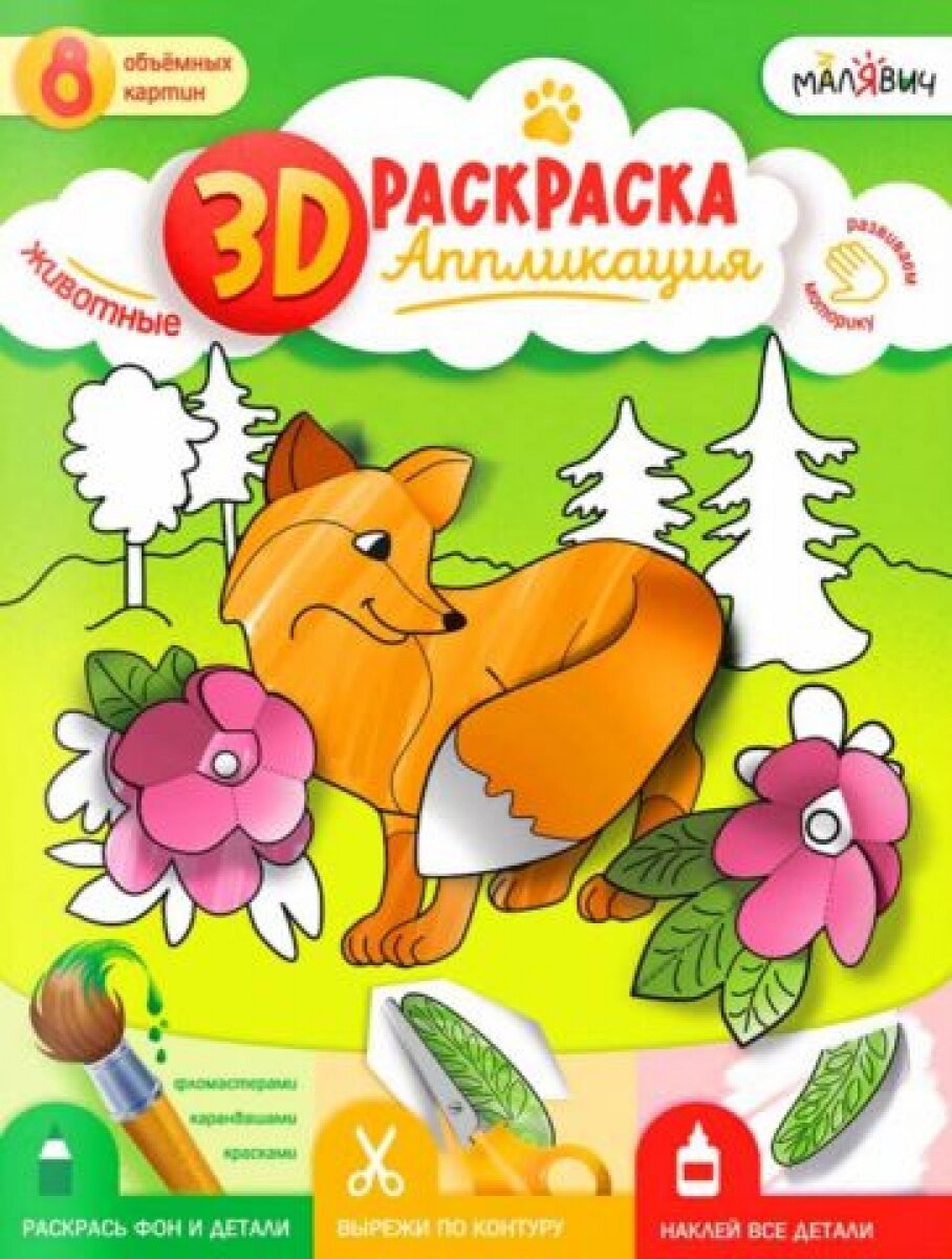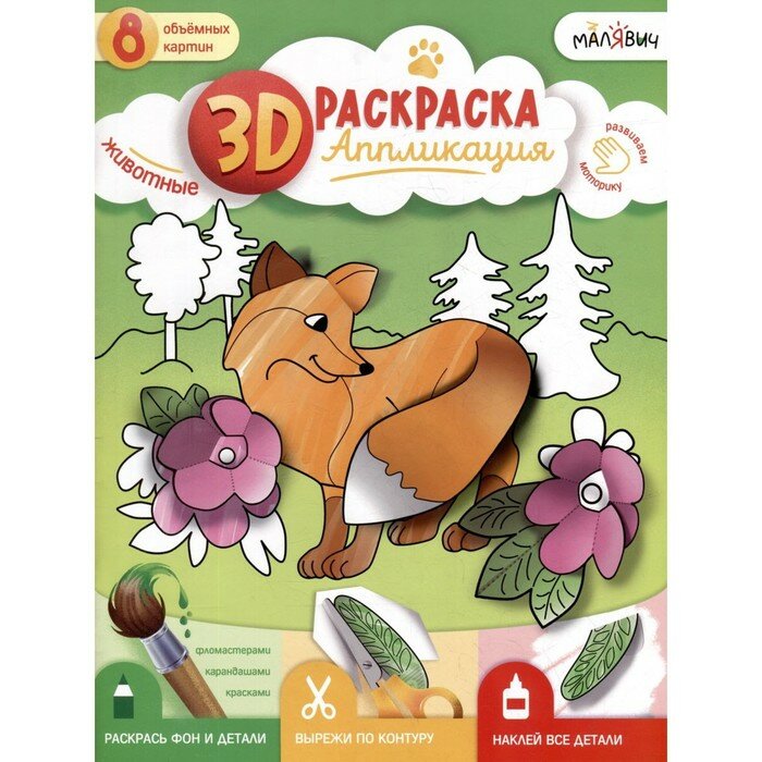 3D-раскраска-аппликация. Животные» под брендом «МалЯвич» – это творческая тетрадь для создания объёмных картин! Внутри 8 картинок животных и детали к ним. Раскрасьте, вырежьте, приклейте – и полюбуйтесь результатом! Готовые картины можно подарить друзьям, украсить ими комнату или устроить выставку. Рекомендовано для детей дошкольного возраста.