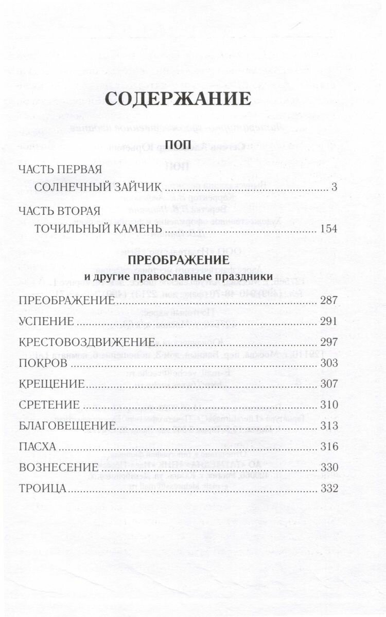 В книгу известного русского писателя Александра Сегеня вошел роман «Поп», повествующий о судьбе православного священника в годы войны на оккупированной фашистами территории Псковской области. Также в книгу включены очерки о православных праздниках.