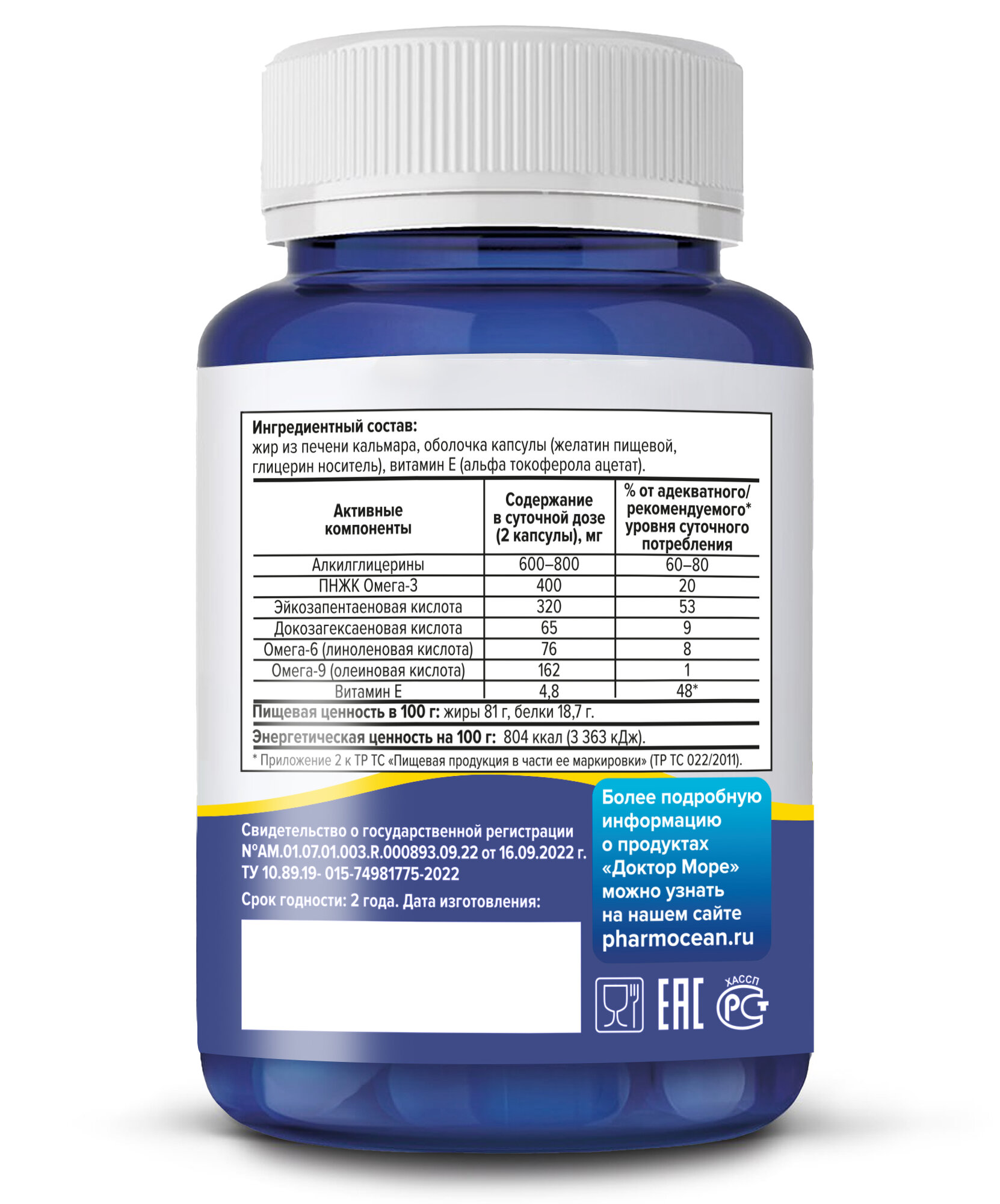 | Состав | жир из печени кальмара, оболочка капсулы (желатин пищевой, глицерин носитель), витамин Е (альфа токоферола ацетат) |