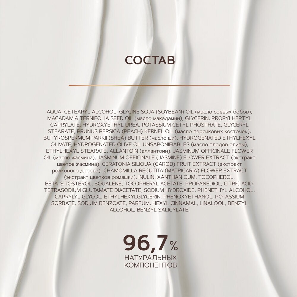 | Состав | Aqua, Cetearyl Alcohol, Soybean Oil, Macadamia Ternifolia Seed Oil, Glycerin, Propylheptyl Caprylate, Hydroxyethyl Urea, Potassium Cetyl Phosphate, Glyceryl Stearate, Peach Kernel Oil, Shea Butter, Hydrogenated Ethylhexyl Olivate, Hydrogenated Olive Oil Unsaponifiables, Ethylhexyl Stearate, Allantoin, Jasminum Officinale Flower Oil, Jasmine Flower Extract, Carob Fruit Extract, Matricaria Flower Extract, Inulin, Xanthan Gum, Tocopherol, Beta-Sitosterol, Squalene, Tocopheryl Acetate, Propanediol, Citric Acid, Tetrasodium Glutamate Diacetate, Sodium Hydroxide, Phenethyl Alcohol, Caprylyl Glycol, Ethylhexylglycerin, Phenoxyethanol, Potassium Sorbate, Sodium Benzoate, Parfum, Hexyl Cinnamal, Linalool, Benzyl Alcohol, Benzyl Salicylate |