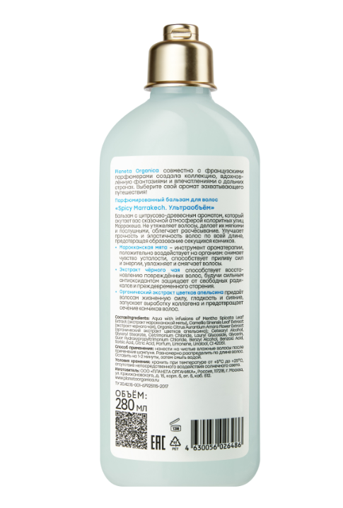 Planeta Organica представляет парфюмерную коллекцию и приглашает отправиться в неповторимое, иногда опасное, иногда волнительное, но всегда завораживающее, путешествие по разным странам мира, где свои непохожие друг на друга истории поведают ароматы. Бальзам с цитрусово-древесным ароматом, который окутает вас сказочной атмосферой колоритных улиц Марракеша.Восстанавливает структуру повреждённых волос, возвращает им природную эластичность и гладкость, предотвращает ломкость. Не утяжеляет волосы, делает их мягкими и послушными, облегчает расчёсывание. Улучшает прочность и эластичность волос по всей длине, предотвращая образование секущихся кончиков. • Марокканская мята – инструмент ароматерапии, положительно воздействует на организм: снимает чувство усталости, способствует приливу сил и энергии, увлажняет и смягчает волосы. • Экстракт чёрного чая способствует восстановлению повреждённых волос, будучи сильным антиоксидантом защищает от свободных радикалов и преждевременного старения. • Органический экстракт цветков апельсина придаёт волосам жизненную силу, гладкость и сияние, запускает выработку коллагена и предотвращает сечение кончиков волос.В комплекте 2 шт.