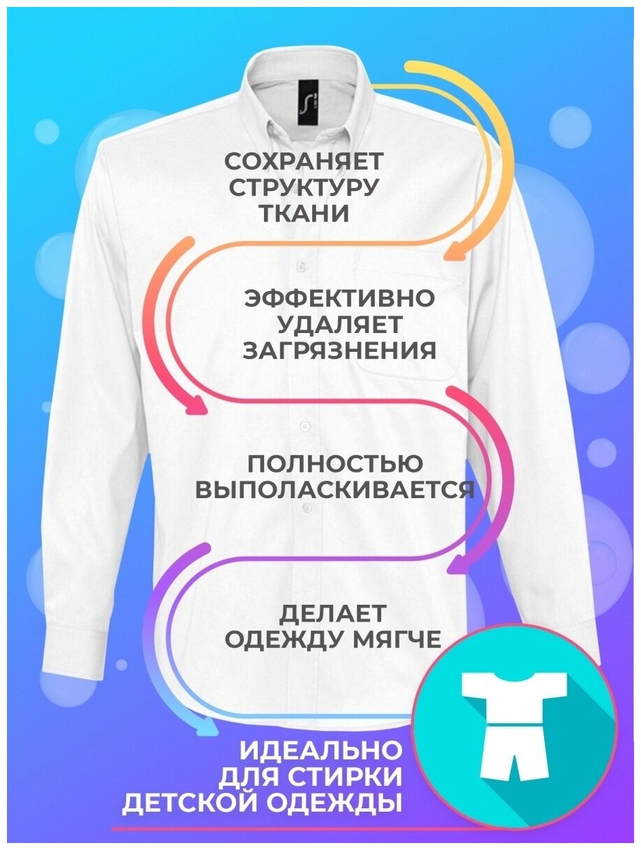 Эффективно удаляет загрязнения, не повреждая волокна ткани, сохраняет насыщенный цвет и первоначальный внешний вид одежды и белья, обеспечивает защиту от изнашивания. Содержит кондиционер. С Энзимами. Без запаха. Предназначено для ручной стирки и стирки в автоматических машинах изделий из хлопчатобумажных, льняных, синтетических и смешанных волокон в воде любой жесткости. Не рекомендуется для стирки изделий из шерсти и шелка.