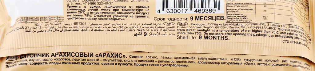 | Состав | патока крахмальная (мальтодекстрин), арахис, «ПЭК» кукурузный молотый, рис молотый, семена подсолнечника, инулин, масло кокосовое, лецитин соевый -эмульгатор, кислота лимонная-регулятор кислотности, ароматизатор натуральный «Орех», экстракт розмарина. |