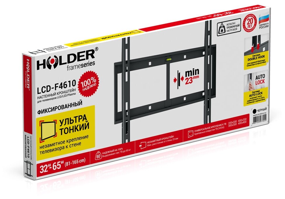 Крепление для ТВ и мониторов Holder , в виде классического рамного основания из стали, предназначено для подвески на стену аппаратуры с размером экрана от 32 до 65 дюймов. Крепление может удерживать вес до 60 кг. Множество размеров монтажных отверстий VESA обеспечит точное соответствие крепежным отверстиям на задней панели телевизоров различных марок. Специальная защелка надежно зафиксирует телевизор на кронштейне с легким щелчком. В планку крепления встроен пузырьковый уровень для удобства монтажа. В комплекте Holder имеется инструкция, которая поможет справиться с самостоятельной установкой изделия.
