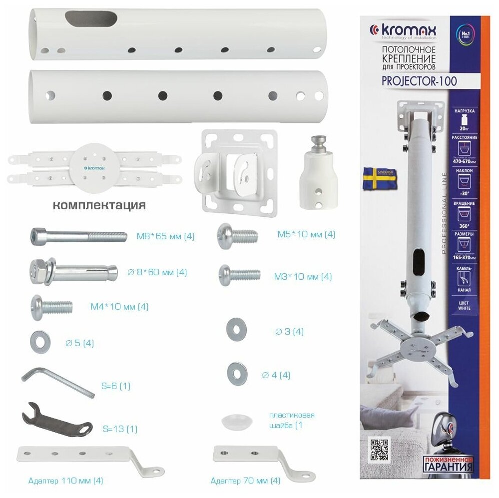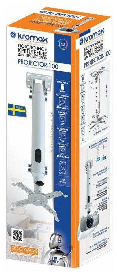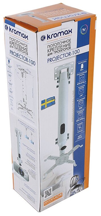 Универсальное крепление для видеопроекторов Kromax обладает удобной и надежной регулировкой поворота и наклона. Модель Kromax располагает возможностью укладки электропроводов внутри крепежа круглой штанги. Kromax совместим с большинством видеопроекторов. Минимальное регулируемое расстояние от стенки составляет 470 мм, а максимальное 670 мм. Нагрузка на кронштейн Kromax не должна превышать 20 кг. Цвет модели – черный. Наклон Kromax до 30 градусов.