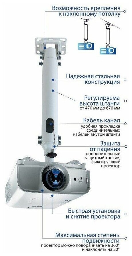 | Описание | Универсальный потолочный кронштейн для проекторов с максимально удобной системой установки наклона и поворота. Прочная конструкция позволит надежно закрепить проектор. Регулируемое расстояние от потолка до проектора 470-670 мм. |