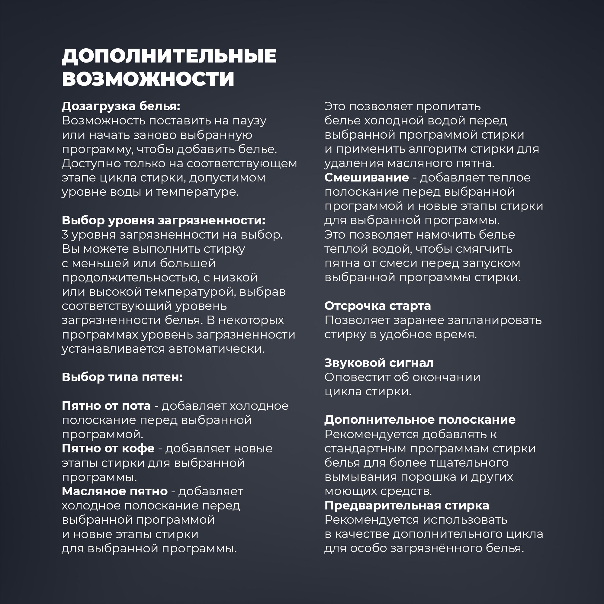 | Добавление белья во время стирки | есть |