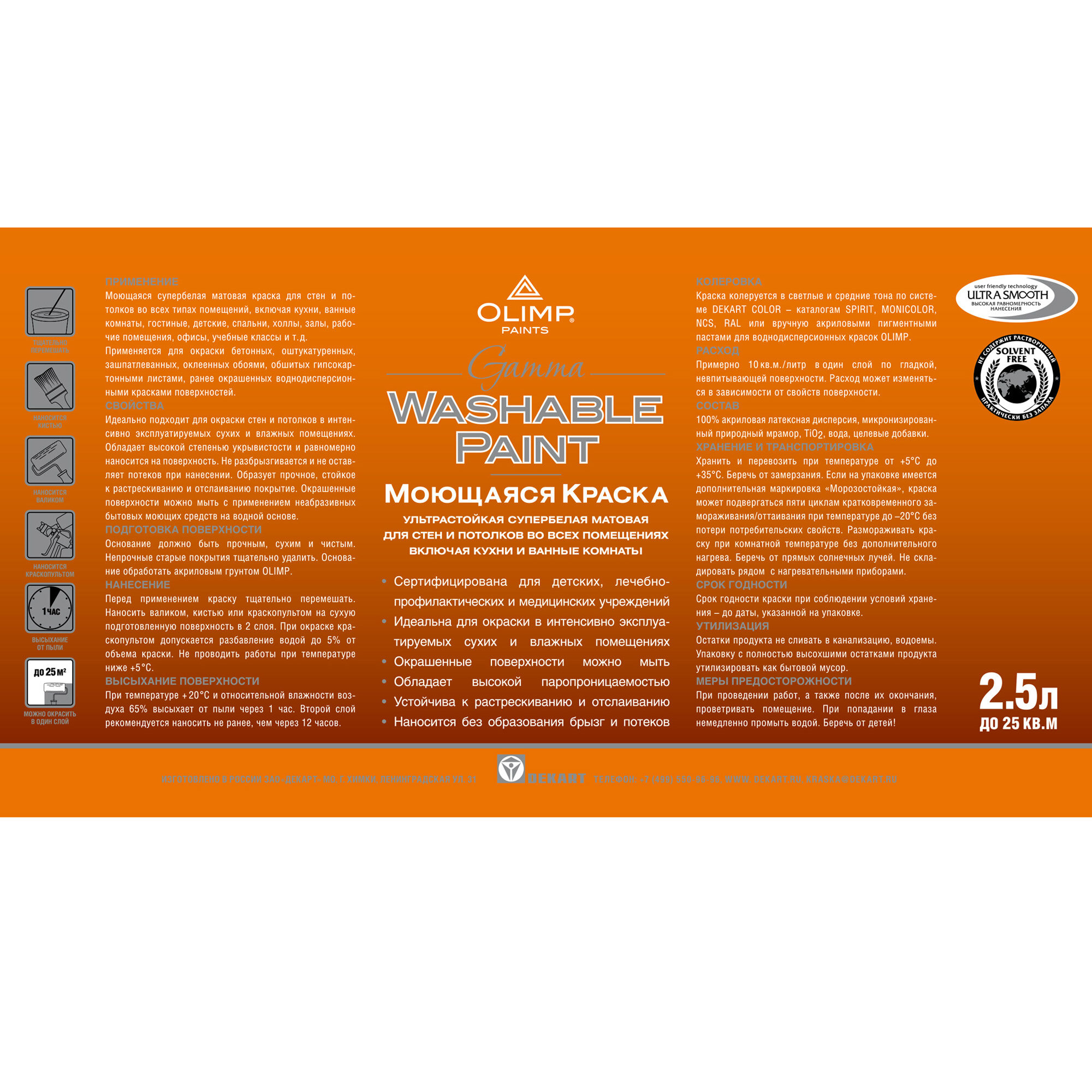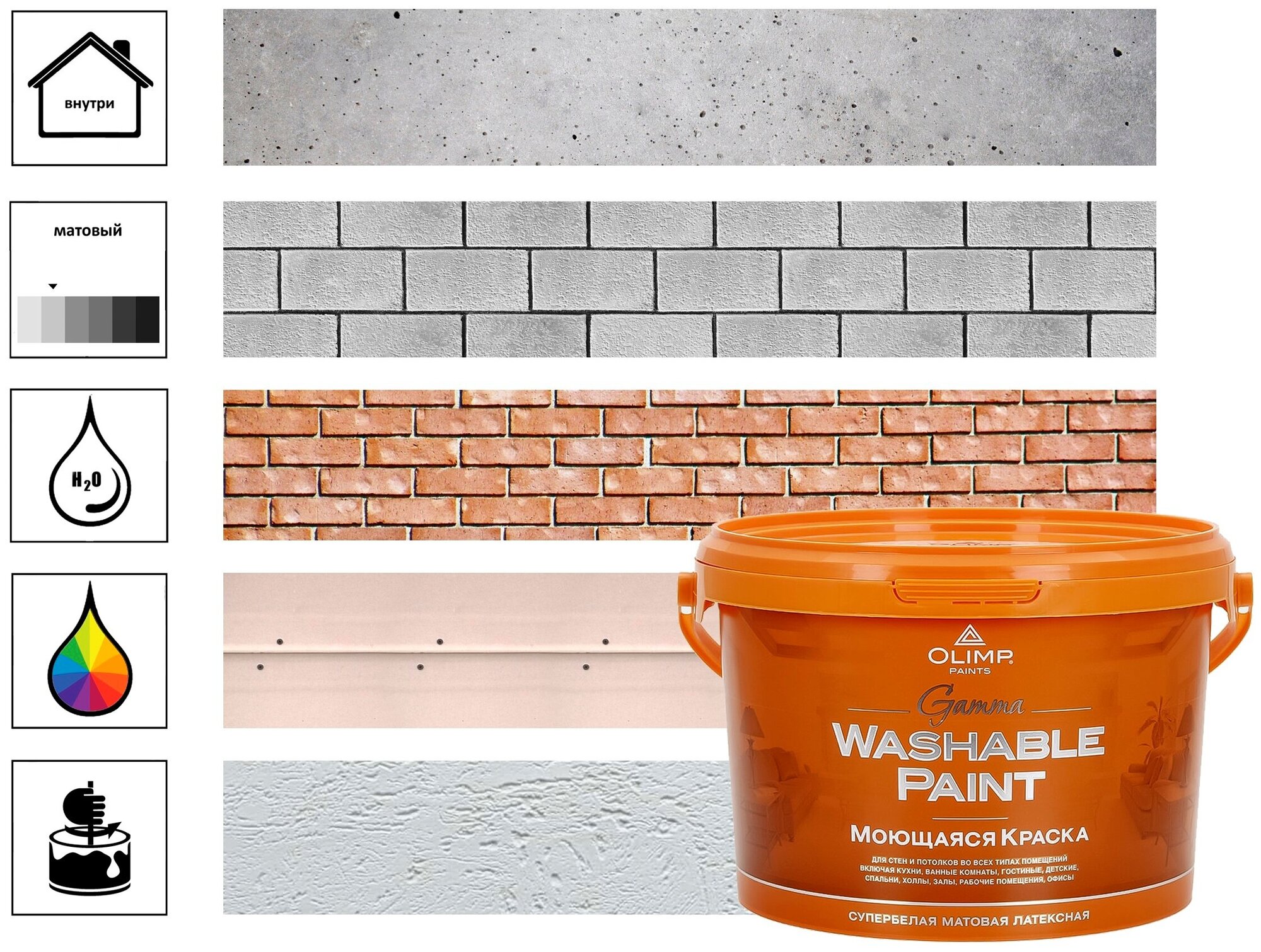 Матовая моющаяся акриловая интерьерная краска для стен и потолков в помещениях с высокой эксплуатационной нагрузкой (холлы, лестницы, торговые залы) и помещениях с повышенной влажностью (кухни, ванные комнаты).