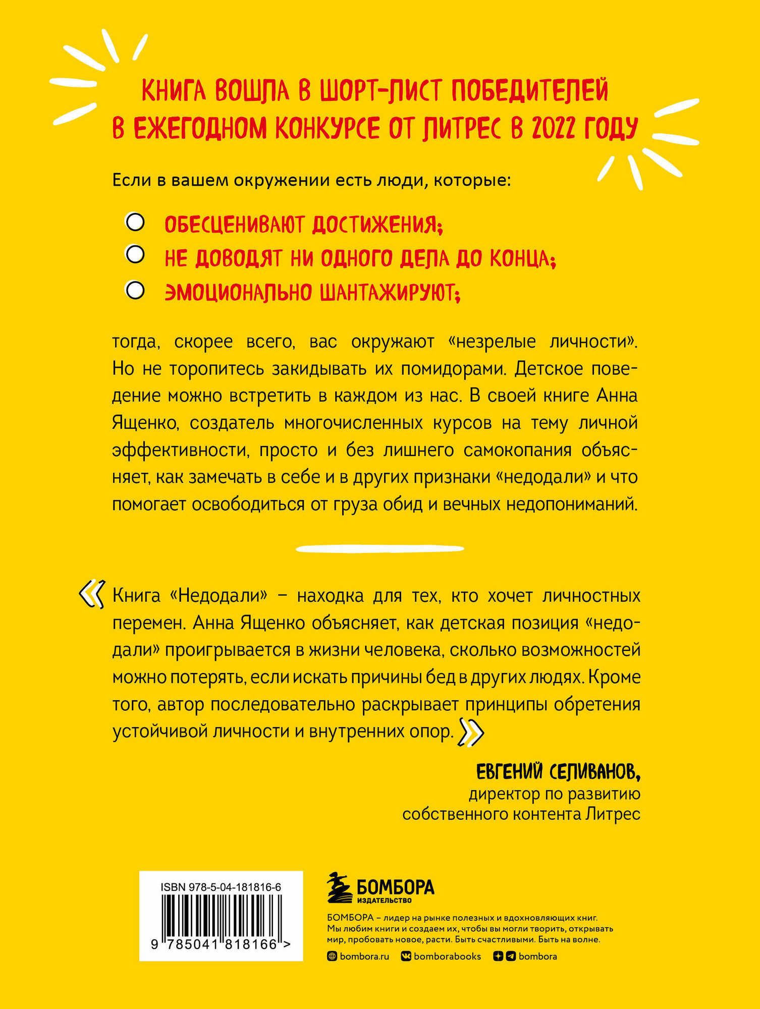 Книга «Недодали» — находка для тех, кто хочет личностных перемен. Анна Ященко объясняет, как детская позиция “недодали” проигрывается в жизни человека, сколько возможностей можно потерять, если искать причины бед в других людях. Кроме того, автор последовательно раскрывает принципы обретения устойчивой личности и внутренних опор.
