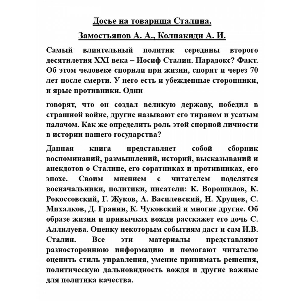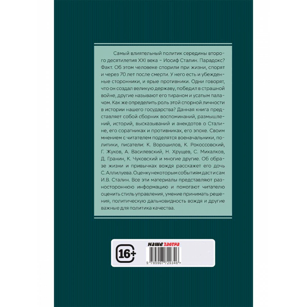 Данная книга представляет собой сборник воспоминаний, размышлений, историй, высказываний и анекдотов о Сталине, его соратниках и противниках, его эпохе. Своим мнением с читателем поделятся военачальники, политики, писатели: К. Ворошилов, К. Рокоссовский, Г. Жуков, А. Василевский, Н. Хрущев, С. Михалков, Д. Гранин, К. Чуковский и многие другие. Об образе жизни и привычках вождя расскажет его дочь С. Аллилуева. Оценку некоторым событиям даст и сам И.В. Сталин. Все эти материалы представляют разностороннюю информацию и помогают читателю оценить стиль управления, умение принимать решения, политическую дальновидность вождя и другие важные для политика качества.