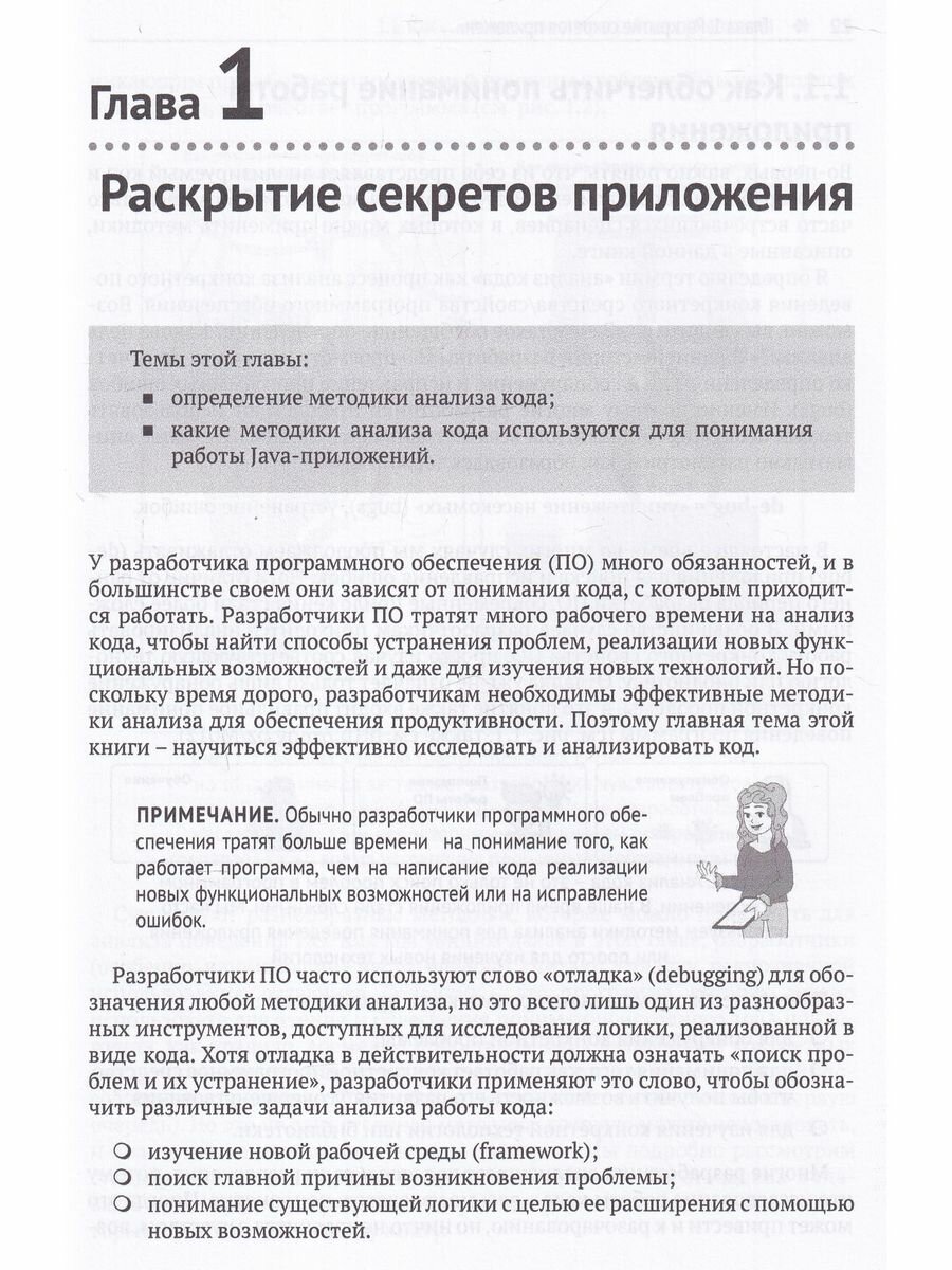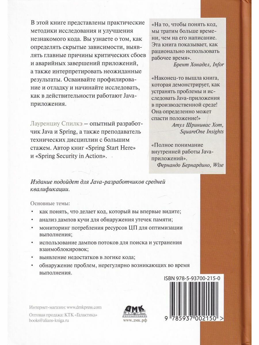 В этой книге представлены практические методики исследования и улучшения незнакомого кода. Вы узнаете о том, как определять скрытые зависимости, выявлять главные причины критических сбоев и аварийных завершений приложений, а также ин-терпретировать неожиданные результаты. Осваивайте профилирование и отладку и начинайте исследовать, как в действительности работают Java-приложения.