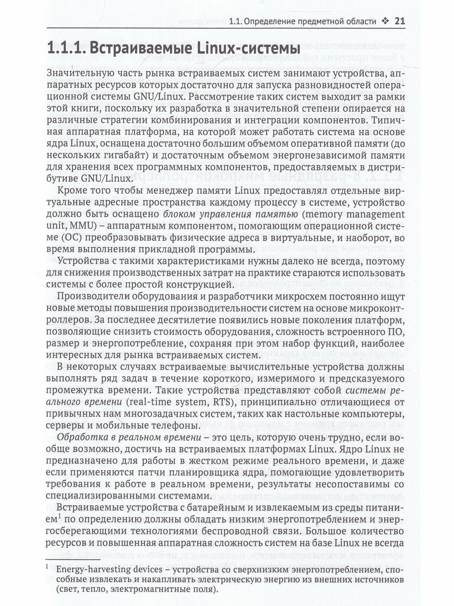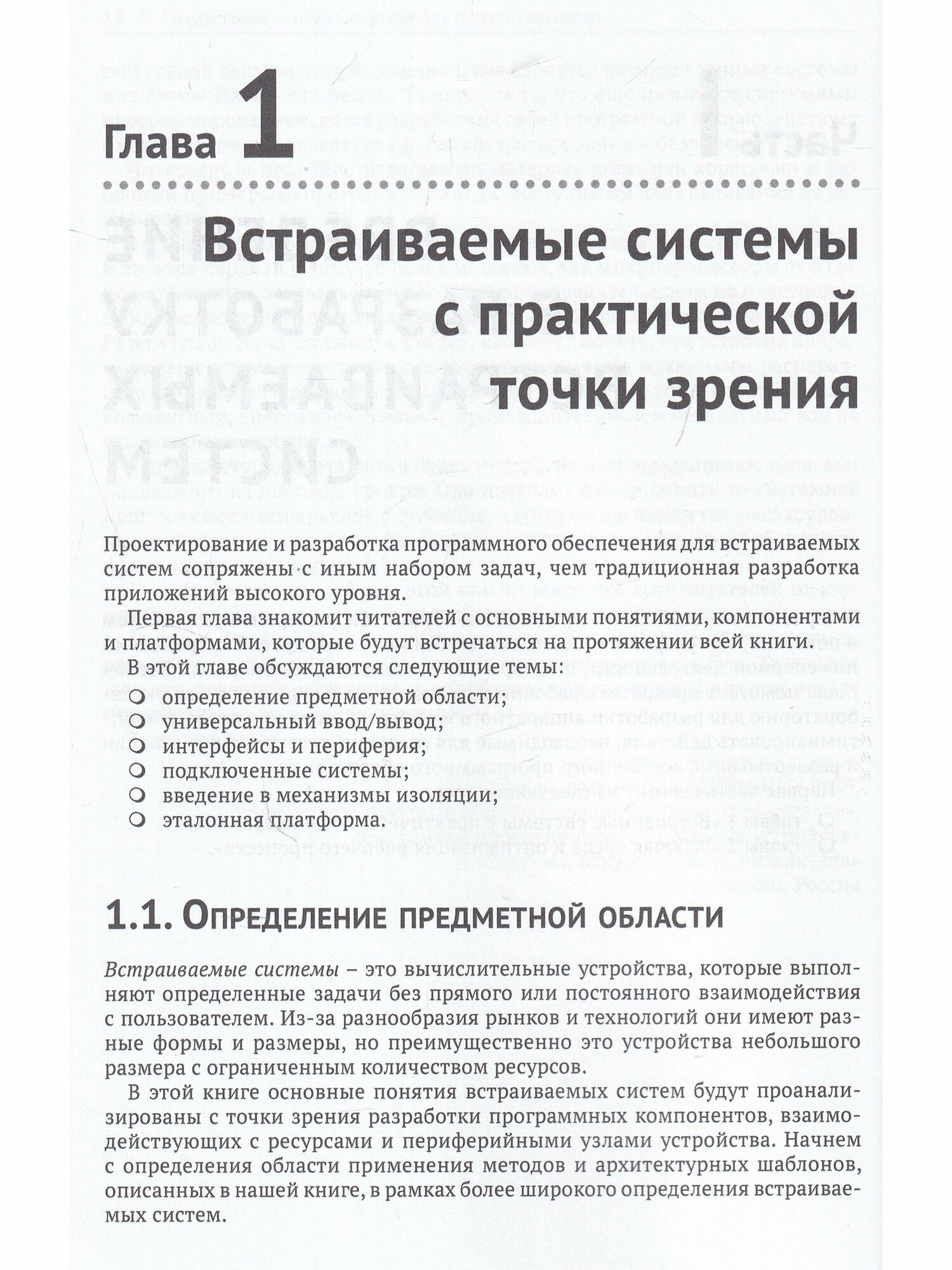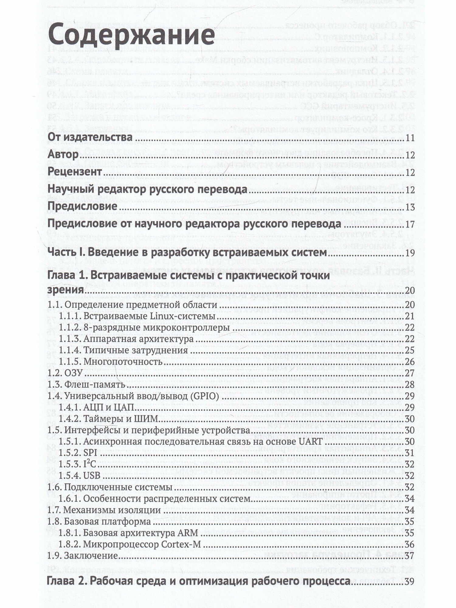 В первой главе кратко встраиваемых системах и как они устроены. Во второй главе даются практические рекомендации, как организовать рабочий процесс и настроить среду и другие инструменты разработчика встраиваемых систем. Третья глава посвящена описанию жизненного цикла разработки встраиваемой системы. В четвертой главе описана процедура загрузки и выполнения программного кода. В пятой главе рассказано про управление памятью: отображение памяти, стек выполнения, динамическое выделение памяти, защиту памяти. В шестой главе рассказывается, как взаимодействовать с периферийными устройствами. Седьмая глава посвящена стандартным локальным шинам (UART, SPI, I2C). В восьмой главе рассказывается про управление питанием и энергосбережением встраи-ваемой системы. Девятая глава затрагивает подключение встраиваемых систем к сетям передачи данных и Интернет вещей. В десятой главе описаны основы параллельного выполнения задач и работы планировщика. В одиннадцатой главе описаны принципы управления системными ресурсами и организации доверенной среды выполнения.