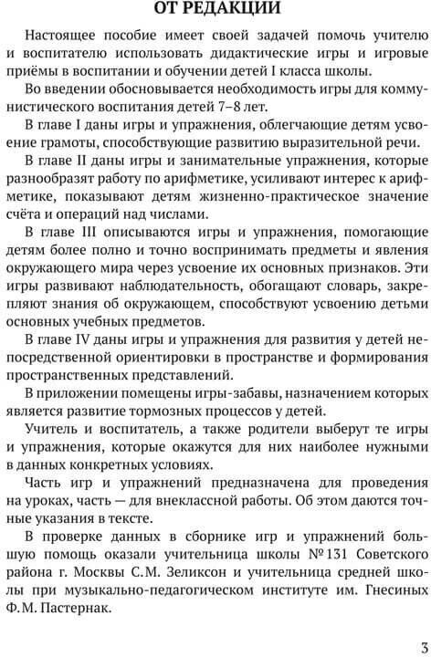 Отечественные методисты и учителя выработали ряд эффективных приёмов для развития внимания и лучшего усвоения учебного материала у детей в 1 классе. Их наработки по методике развития ребенка взяты за основу при составлении этой советской книги. Данное учебное пособие обобщает богатый опыт и практические исследования советской школы.Перед вами сборник увлекательных дидактических игр и занимательных упражнений для школьников, учащихся в 1 классе. Основная цель этого советского учебника – помочь учителю, воспитателю или родителям задействовать игровые приемы в решении образовательных задач. Так, развивающие игры для детей по русскому языку способствуют развитию речи, а арифметические упражнения помогают обучению счету. Пособие знакомит детей с основными признаками предметов (цвет, величина, форма) и пространственными представлениями (налево, направо, вперед, вверх, вдоль, напротив, близко и др.). В приложении приведены игры-забавы, которые развлекают детей и одновременно способствуют развитию мозга, развивают кругозор. Часть упражнений и игр по речевому развитию предназначена для проведения на уроках, часть – для внеклассной работы, о чём содержится указание в тексте.Пособие будет отличным дополнением для учителя начальных классов при подготовке к занятиям по русскому языку и математике.