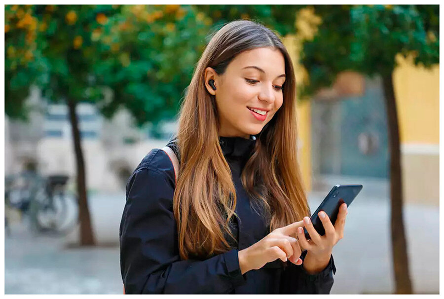Наушники имеют внутриканальную конструкцию. Они плотно устанавливаются в ушные каналы, обеспечивая герметичную посадку. Модель с 6-мм излучателями воспроизводит звуки в диапазоне 20-20000 Гц. Оснащены ИИ-микрофоном с функцией шумоподавления. Фильтрации от посторонних шумов улучшает качество связи. Наушники подключаются к устройствам через Bluetooth-канал.