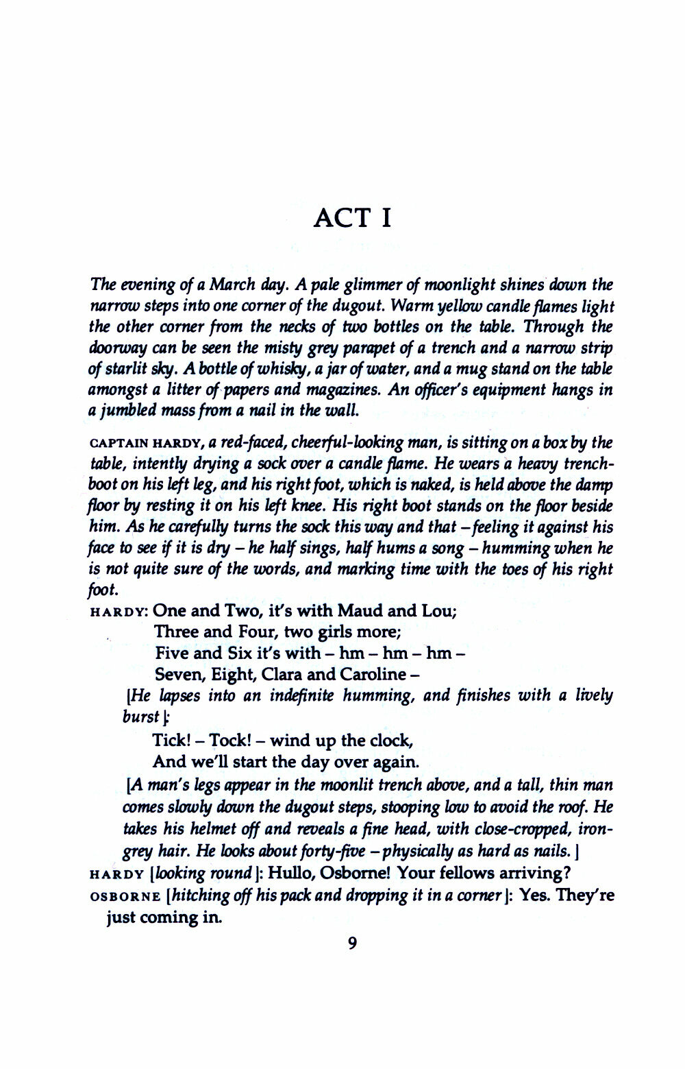 the play was an instant stage success and remains a remarkable anti-war classic. R.C. Sherriff (1896-1975) joined the army shortly after the outbreak of the First World War, serving as a captain in the East Surrey regiment. After the war, an interest in amateur theatricals led him to try his hand at writing. Following rejection by many theatre managements, Journey's End was given a single performance by the Incorporated Stage Society, in which Lawrence Olivier took the lead role. The play's enormous success enabled Sherriff to become a full-time writer, with plays such as Badger's Green (1930), St Helena (1935), and The Long Sunset (1955);