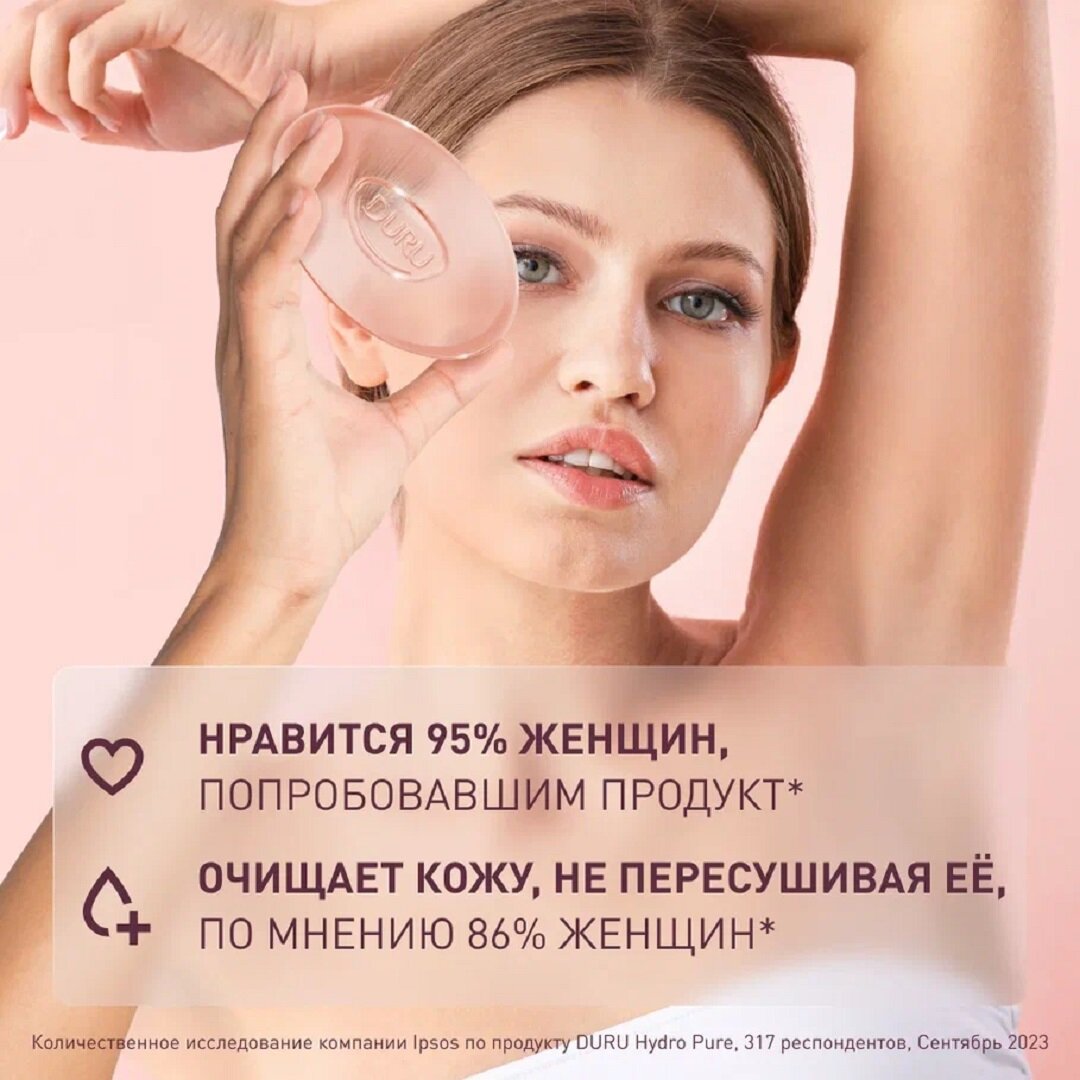 Кристально-прозрачное косметическое мыло DURU Hydro Pure подарит настоящее наслаждение во время использования- оно увлажняет кожу в 10 раз эффективнее, чем обычное туалетное мыло и подходит для использования в душе. Благодаря особой формуле мыло имеет очень приятную текстуру и прозрачный цвет, поэтому выглядит чисто и аккуратно даже после длительного использования. Продукт приятен на ощупь, при контакте с водой образует густую пену и имеет потрясающий аромат. Не содержит парабенов, силиконов и парафина.