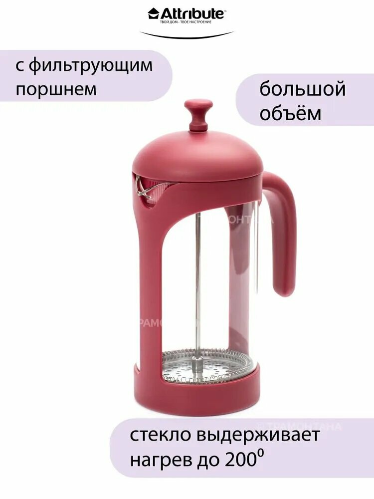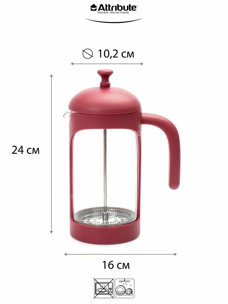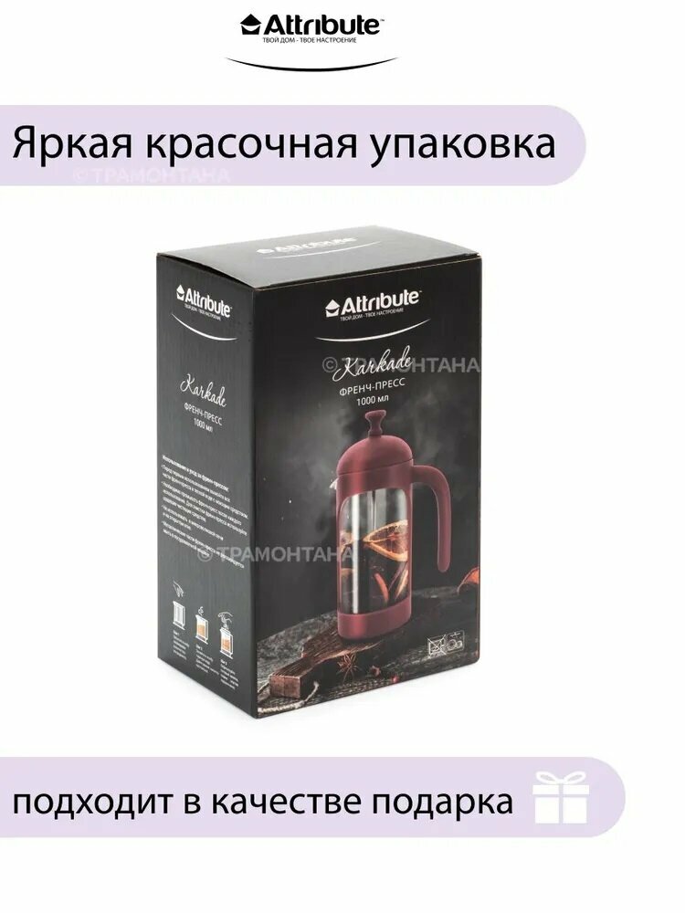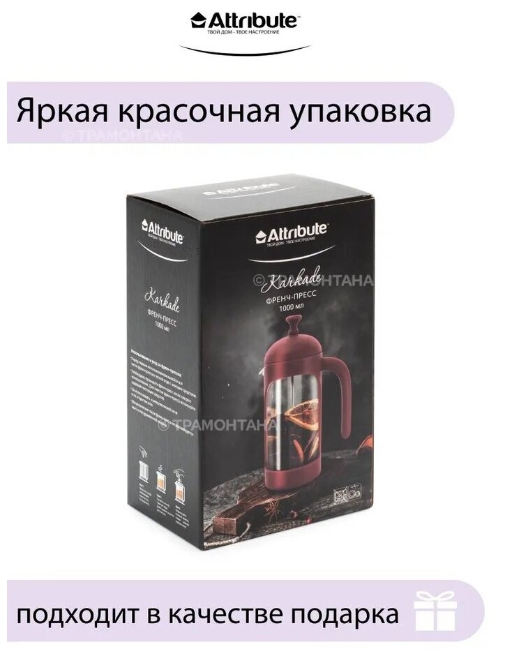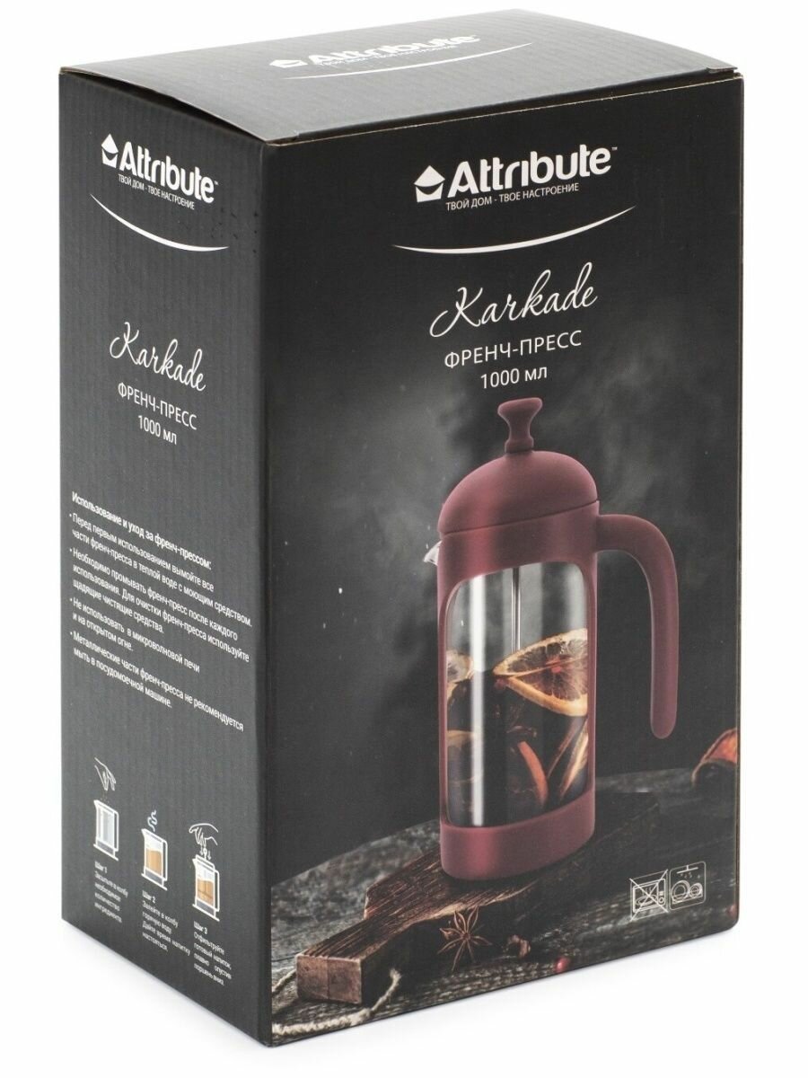Поршневой чайник Attribute Karkade ATF203, 600мл. прекрасно подойдет для заваривания кофе, чая, травяных настоев и даже какао. Вы можете регулировать время приготовления напитка, а также комбинировать его с различными наполнителями (специи, травы, фрукты, ягоды). Заваривание кофе в поршневом чайнике позволяет раскрыть настоящий вкус и аромат этого напитка, ощутить все нюансы и оттенки изысканных сортов кофе. Чайник выполнен из жаропрочного боросиликатного стекла, которое сохраняет вкус и запах напитков.