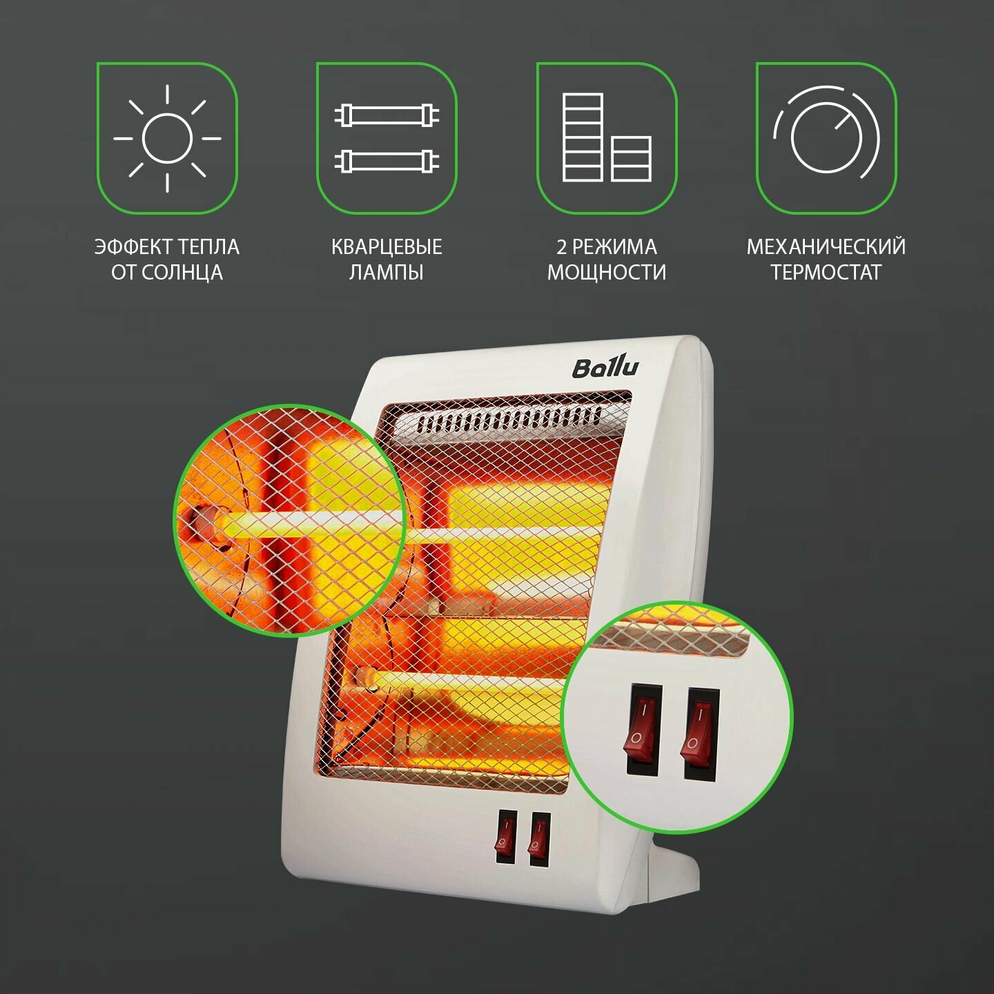 Инфракрасный обогреватель BALLU BHH/M-09N максимально эффективен и прост в эксплуатации. С помощью направленного теплового потока приборы нагревают не воздух вокруг себя, а находящиеся рядом предметы, которые затем отдают тепло воздуху. Таким образом, получается эффект, подобный солнечному обогреву. Поэтому данные обогреватели не сжигают кислород и не сушат воздух, а за счёт отсутствия конвекции во время работы обогревателя, в воздух не поднимается микроскопическая пыль, которая может стать причиной многих заболеваний дыхательных путей. Таким образом инфракрасные обогреватели незаменимы не только внутри помещения, но и на открытом воздухе - на даче, веранде и т.д.