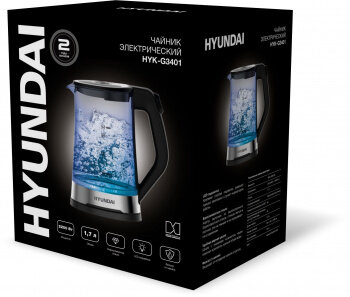 Чайник электрический Hyundai HYK-G3401 черный/серебристый, объём 1.7л, мощность 2200Вт, материал корпуса: стекло