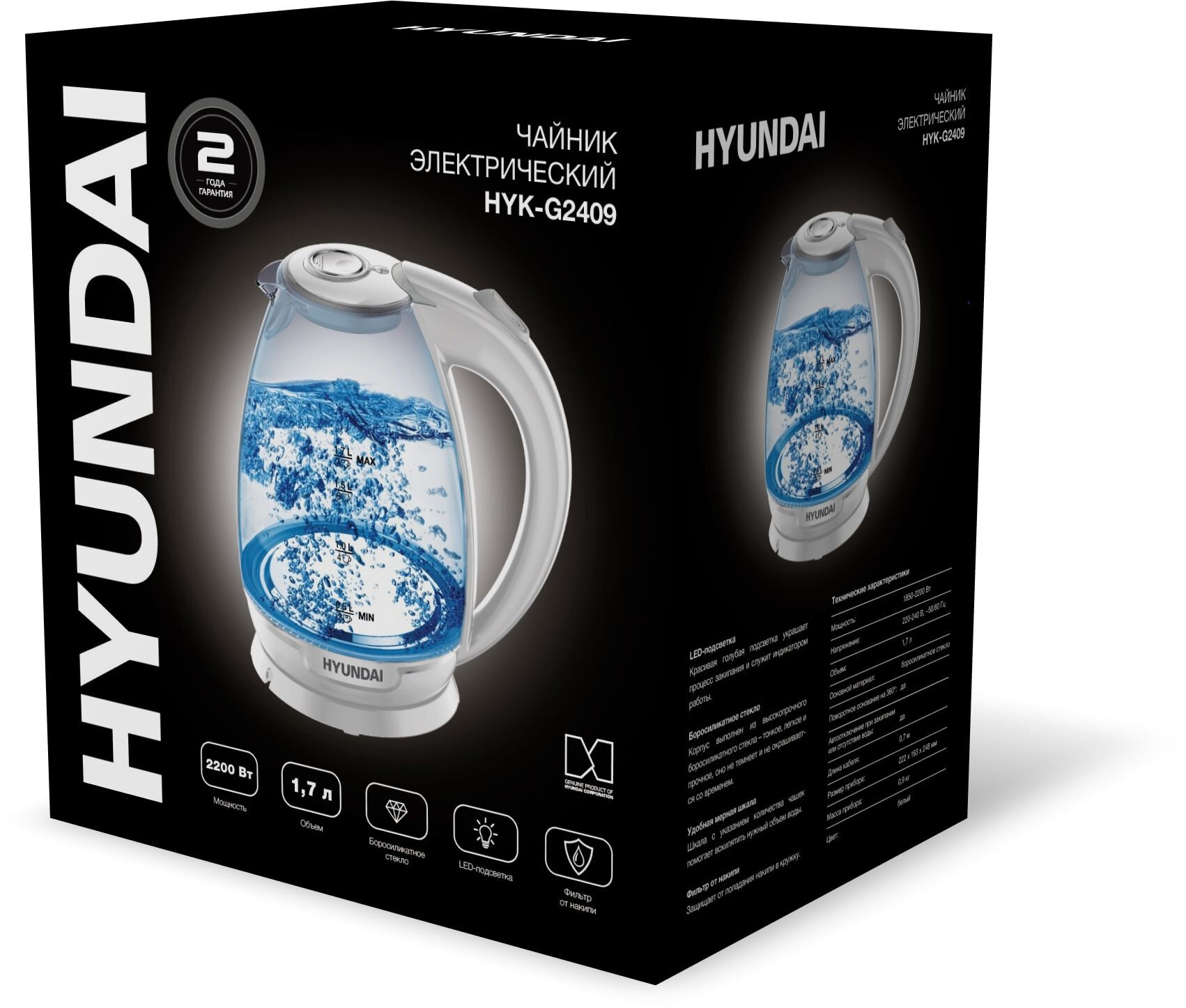 Чайник электрический Hyundai HYK-G2409 белый/серебристый, объём 1.7л, мощность 2200Вт, материал корпуса: стекло