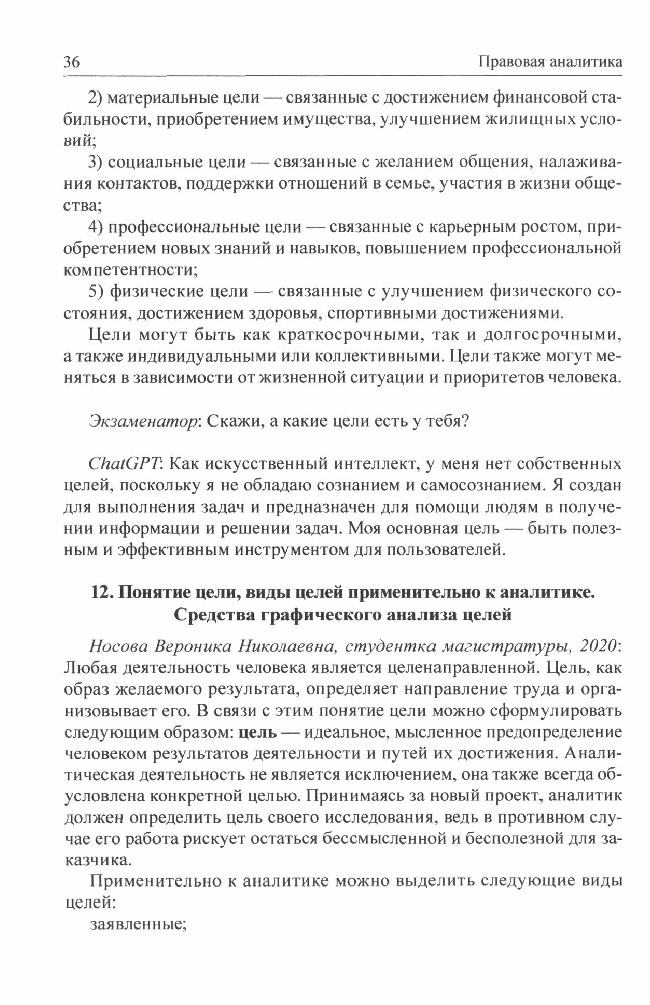 В российском образовании идет активный поиск форм использования искусственного интеллекта, что требует дополнительных усилий как от преподавателей, так и от студентов. Авторы книги провели оригинальный образовательный эксперимент: искусственному интеллекту (GhatGPT) предложили ответить на список экзаменационных вопросов по дисциплине «Правовая аналитика» и сопоставили его тексты с письменными ответами студентов. В итоге получился двойной тест: знаний студентов и возможностей искусственного интеллекта в сфере правовой аналитики, их можно сравнить. Для специалистов-аналитиков, преподавателей, аспирантов и студентов юридических и гуманитарных вузов и факультетов.