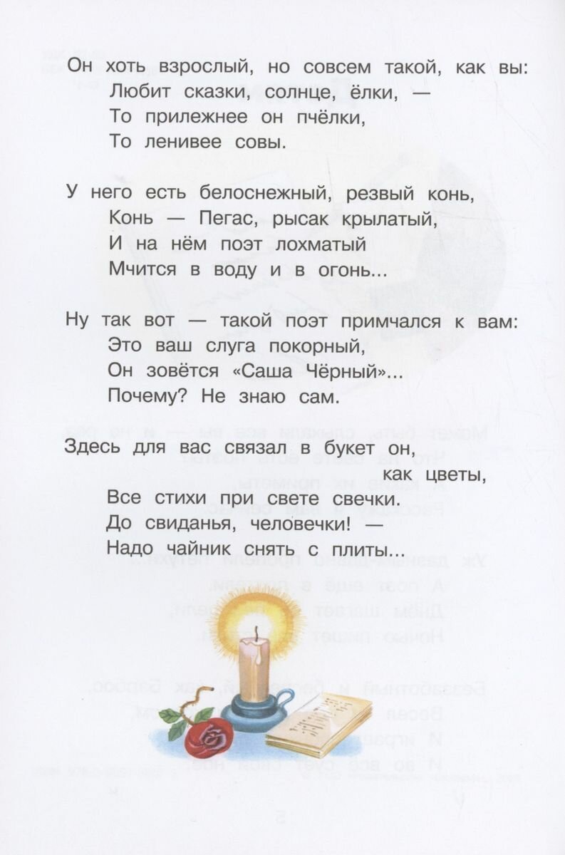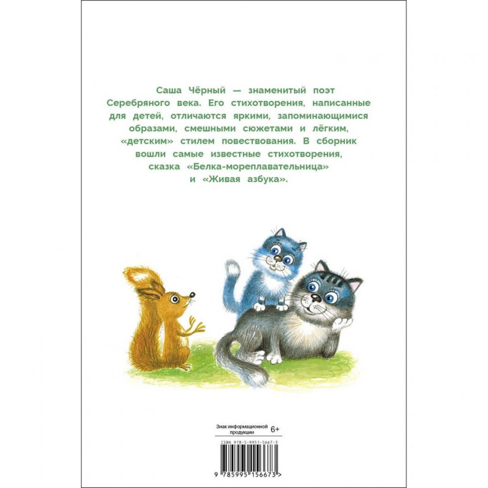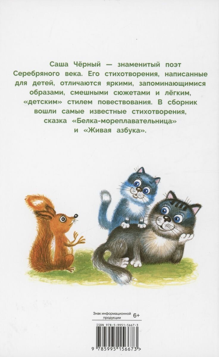 Саша Чёрный – знаменитый поэт Серебряного века. Его стихотворения, написанные для детей, отличаются яркими, запоминающимися образами, смешными сюжетами и лёгким, “детским” стилем повествования. В сборник вошли самые известные стихотворения, сказка “Белка-мореплавательница” и “Живая азбука”.