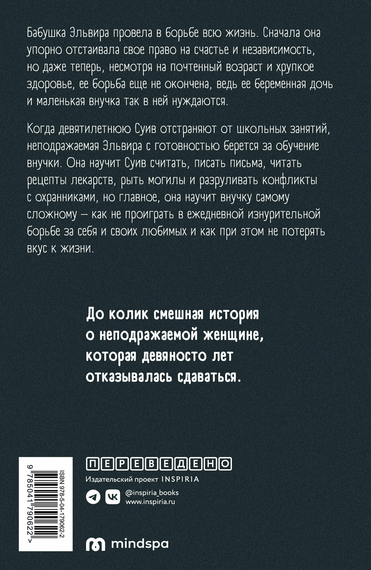 Когда девятилетнюю Суив отстраняют от школьных занятий, неподражаемая Эльвира с готовностью берется за обучение внучки. Она научит Суив считать, писать письма, читать рецепты лекарств, рыть могилы и разруливать конфликты с охранниками, но главное, она научит внучку самому сложному – как не проиграть в ежедневной изнурительной борьбе за себя и своих любимых, и как при этом не потерять вкус к жизни.