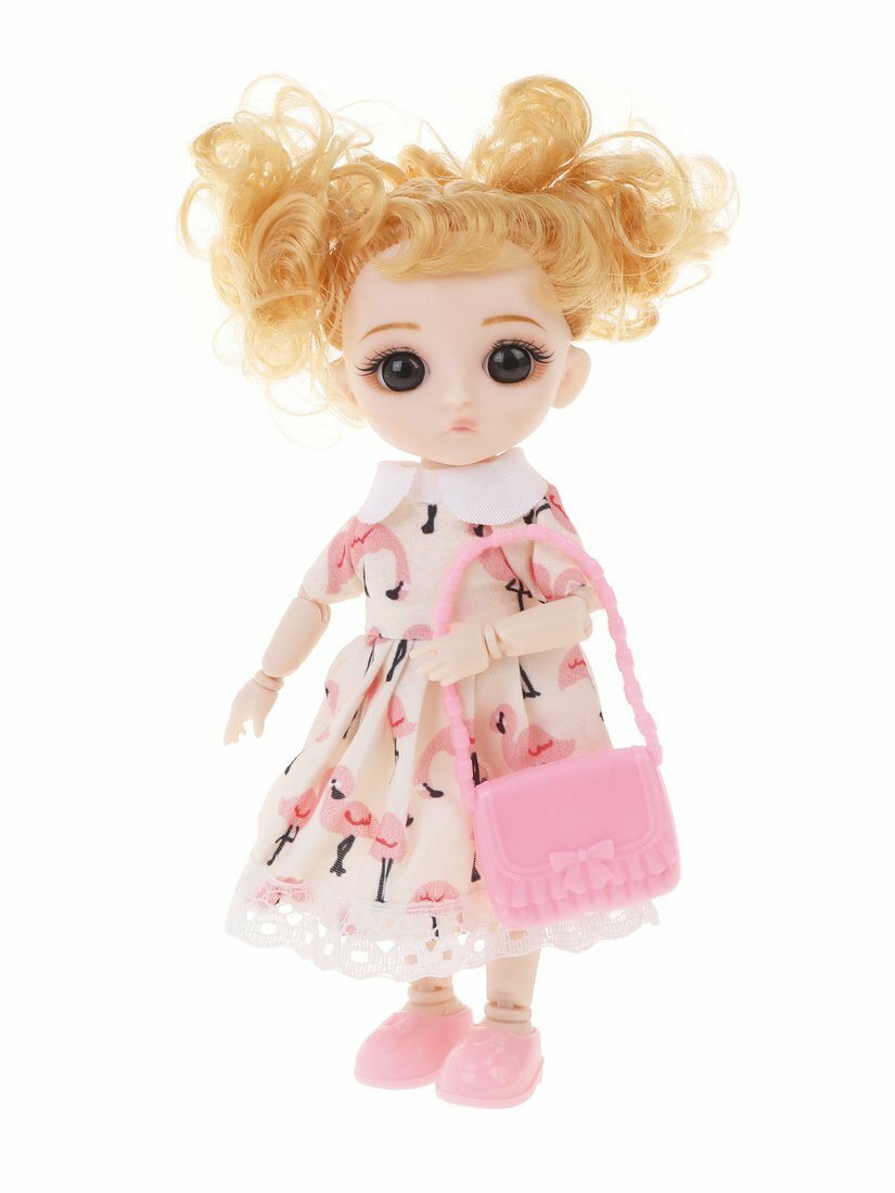 Девочка любит играть в куклы? Тогда ей точно приглянется игровой набор Модница! Прекрасная куколка представлена в стильном платьице с принтом фламинго. У нее очаровательное личико и большие выразительные глазки, шелковистые волосы светло-пшеничного цвета, а также шарнирные руки и ноги (8 точек артикуляции). В комплекте с куклой прилагается сумочка.