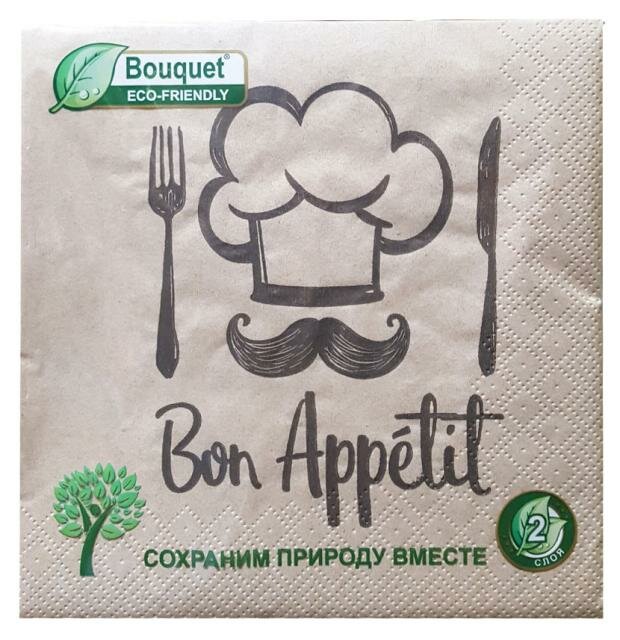 Салфетки бумажные Bouquet Bon Appetit, двухслойные, 33х33 см, 25 шт, 2 упСалфетки бумажные трехслойные Art Bouquet с оригинальными дизайнами, изготовленные из экологически чистого сырья - 100% целлюлозы, помогут в сервировке праздничного стола. Благодаря трем слоям материала и объемному тиснению отличаются прочностью и впитываемостью. Яркий дизайн салфеток придется вам по душе и подарит положительные эмоции. Также салфетки подходят для декупажа мебели, бутылок, ваз и других предметов интерьера. Салфетки изготовлены из крафт-бумаги.